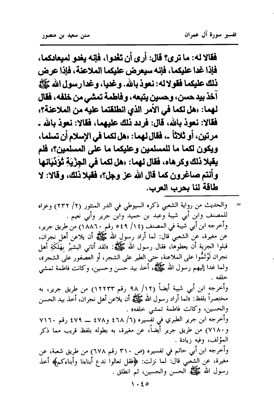 وأخرجه ابن أبي حاتم في "تفسيره" (ص٣١٠ رقم ٦٧٨) من طريق شعبة، عَنْ مُغِيرَةَ، عَنِ الشَّعْبِيِّ قَالَ: لما نزلت: {فَقُلْ تَعَالَوْا نَدْعُ أَبْنَاءَنَا وَأَبْنَاءَكُمْ} أخذ رَسُولُ اللَّهِ - صَلَّى اللهُ عَلَيْهِ وسلم - الحسن والحسين، ثم انطلق.