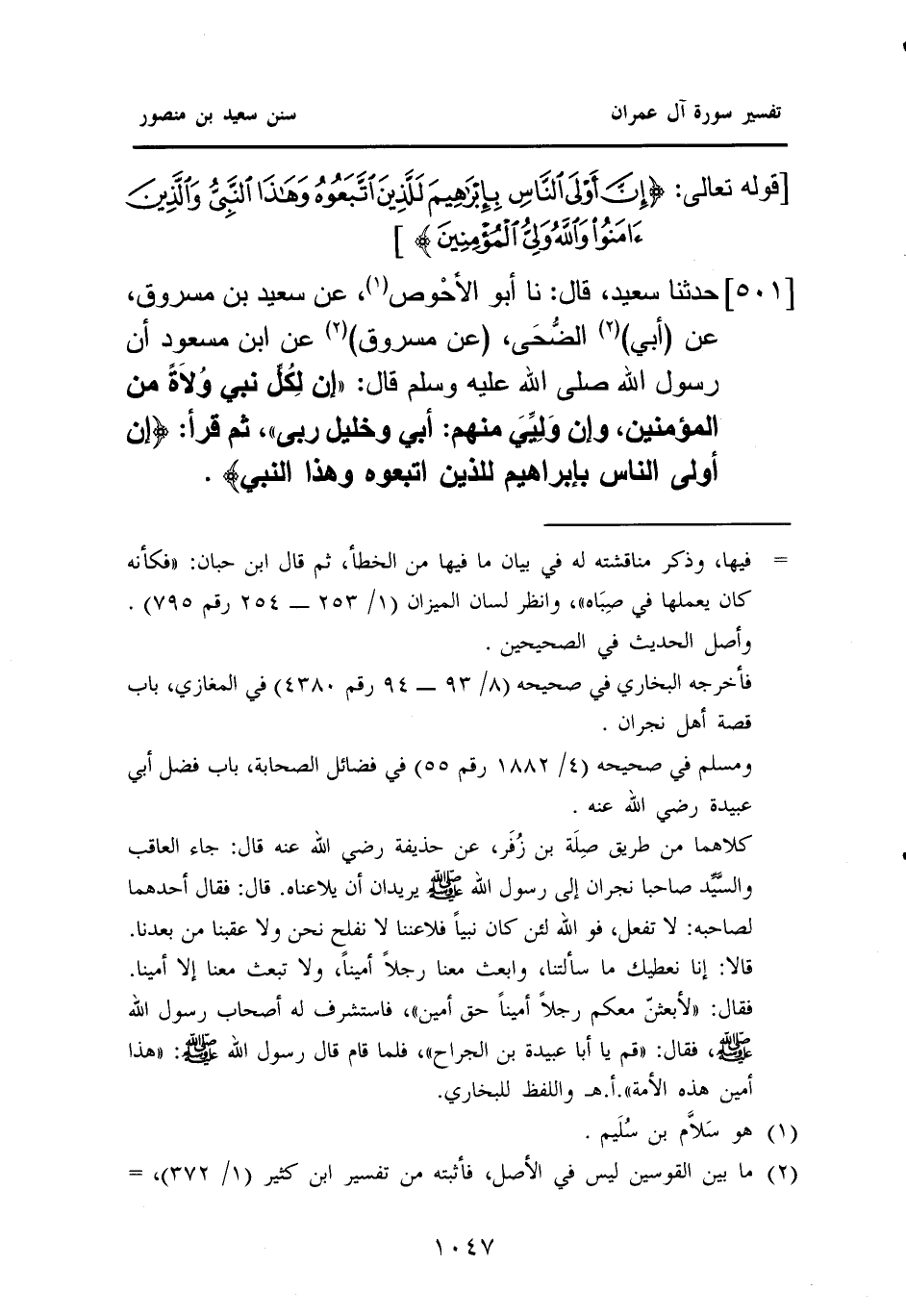 ٥٠١ - حَدَّثَنَا سَعِيدٌ، قَالَ: نا أَبُو الْأَحْوَصِ (¬١)، عَنْ سَعِيدِ بْنِ مَسْرُوقٍ، عَنْ (أَبِي) (¬٢) الضُّحَى، (عَنْ مَسْرُوقٍ) (¬٣)، عَنِ ابْنِ مَسْعُودٍ: أَنَّ رَسُولَ اللَّهِ صَلَّى اللهُ عَلَيْهِ وَسَلَّمَ قَالَ: ((إِنَّ لِكُلِّ نَبِيٍّ وُلاةً مِنَ الْمُؤْمِنِينَ، وَإِنَّ وَلِيِّي مِنْهُمْ: أَبِي وَخَلِيلُ رَبِّي))، ثُمَّ قَرَأَ: {إِنَّ أَوْلَى النَّاسِ بِإِبْرَاهِيمَ لَلَّذِينَ اتَّبَعُوهُ وَهَذَا النَّبِيُّ}.