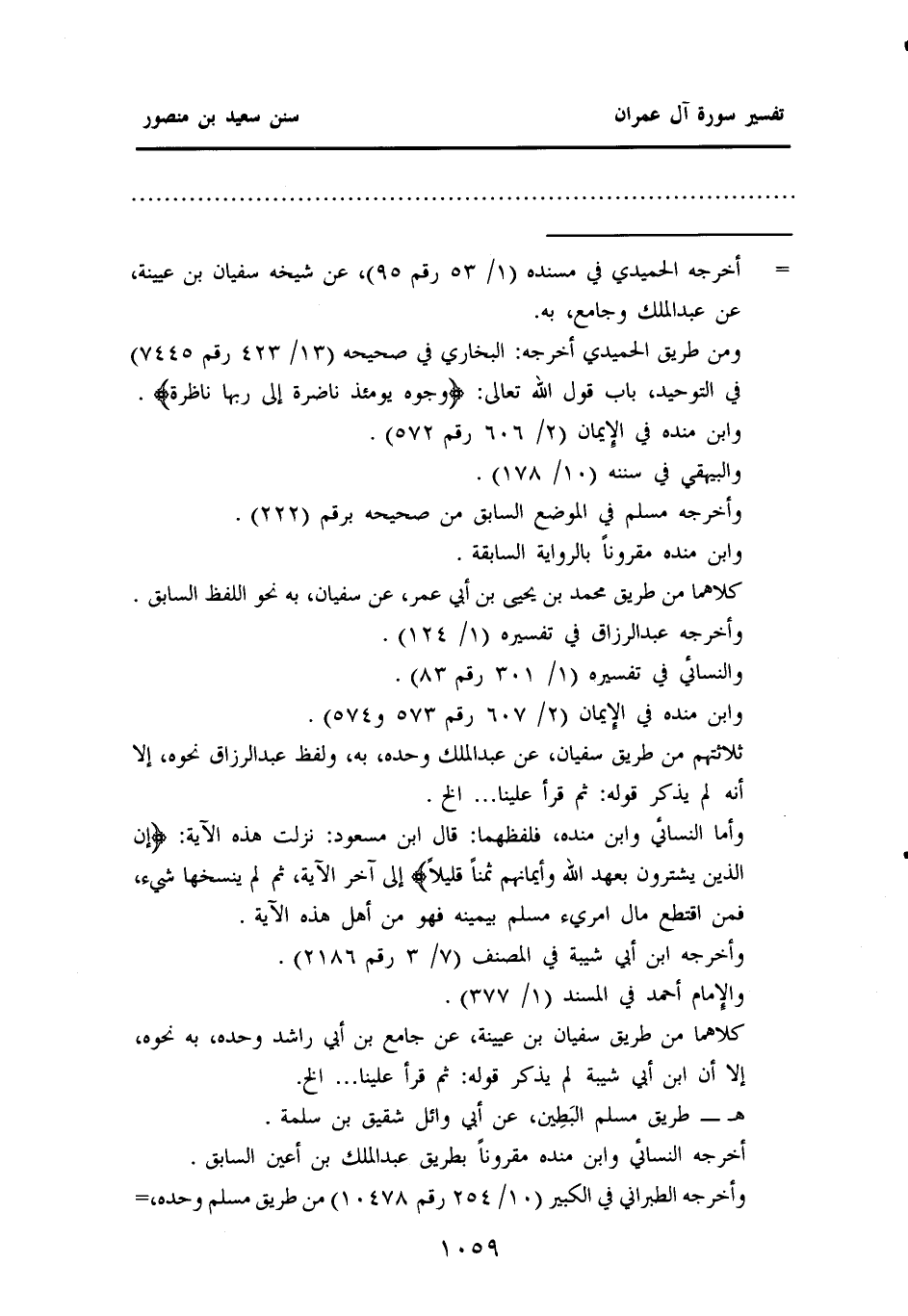 ومن طريق الحميدي أخرجه: البخاري في "صحيحه" (١٣ / ٤٢٣ رقم ٧٤٤٥) في التوحيد، باب قول الله تعالى: {وجوه يومئذ ناضرة إلى ربها ناظرة} .