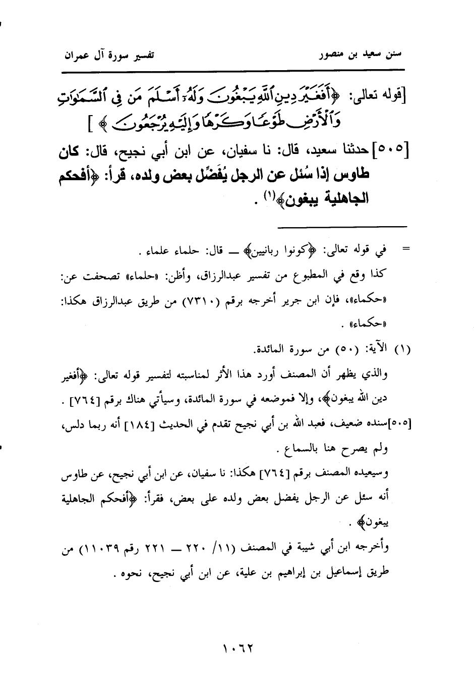 ٥٠٥ - حَدَّثَنَا سَعِيدٌ، قَالَ: نا سُفْيَانُ، عَنِ ابْنِ أَبِي نَجِيحٍ، قَالَ: كَانَ طَاوُسٌ إِذَا سُئل عَنِ الرَّجُلِ يُفَضِّل بَعْضَ وَلَدِهِ، قَرَأَ: {أَفَحُكْمَ الجَاهِلِيَّةِ يَبْغُونَ} (¬١).
