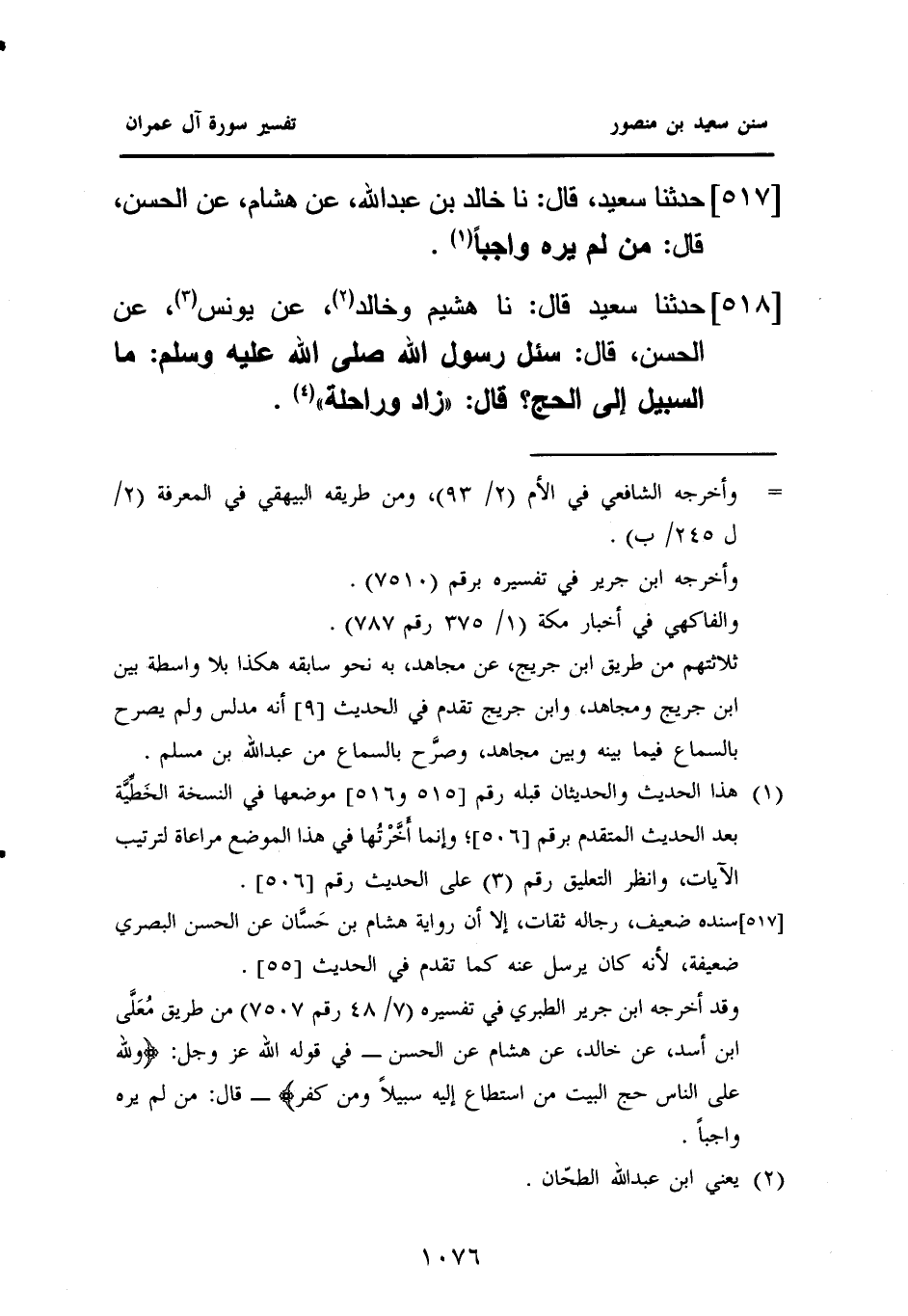 وقد أخرجه ابن جرير الطبري في "تفسيره" (٧/ ٤٨ رقم ٧٥٠٧) من طريق مُعَلَّى ابن أسد، عن خالد، عن هشام عن الحسن - في قوله الله عز وجل: {وَلِلَّهِ عَلَى النَّاسِ حِجُّ الْبَيْتِ مَنِ اسْتَطَاعَ إِلَيْهِ سَبِيلًا وَمَنْ كفر} - قَالَ: مَنْ لَمْ يَرَهُ وَاجِبًا.