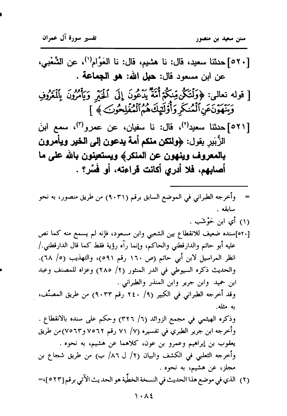 ٥٢١ - حَدَّثَنَا سَعِيدٌ (¬٢)، قَالَ: نا سُفْيَانُ، عَنْ عَمْرٍو (¬٣)، سَمِعَ ابنَ الزُّبَيرِ يَقُولُ: {وَلْتَكُنْ مِنْكُمْ أُمَّةٌ يَدْعُونَ إِلَى الخَيْرِ وَيَأْمُرُونَ بِالمَعْرُوفِ وَيَنْهَوْنَ عَنِ المُنْكَرِ} وَيَسْتَعِينُونَ بِاللَّهِ عَلَى مَا أَصَابَهُمْ، فَلَا أَدْرِي أَكَانَتْ قِرَاءَتَهُ، أَوْ فَسَّر؟.