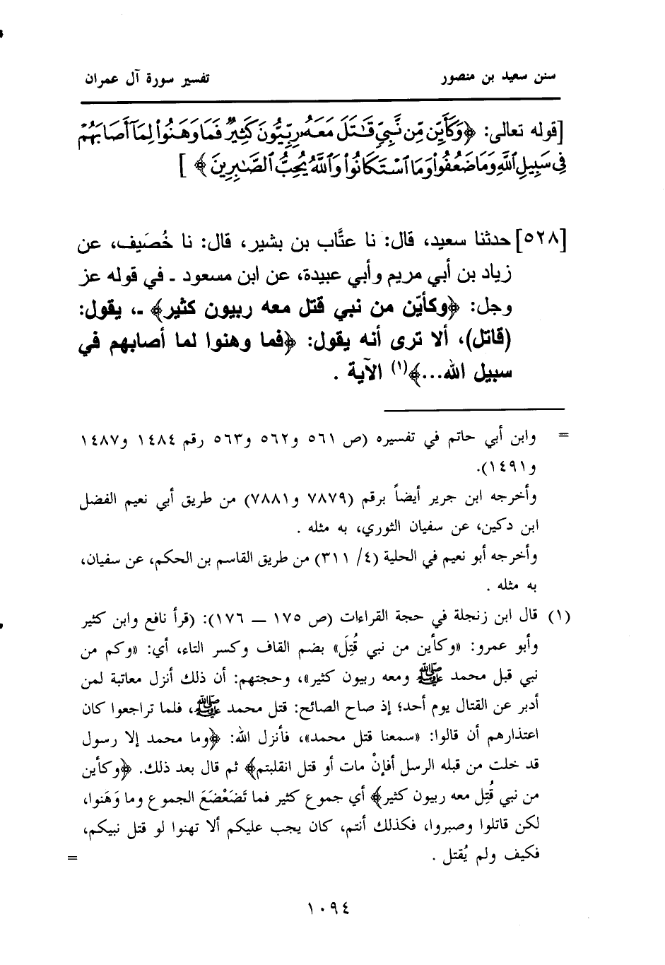 ٥٢٨ - حَدَّثَنَا سَعِيدٌ، قَالَ: نا عتَّاب بْنُ بَشِيرٍ، قَالَ: نا خُصَيف، عَنْ زِيَادِ بْنِ أَبِي مَرْيَمَ، وَأَبِي عُبَيْدَةَ، عَنِ ابْنِ مَسْعُودٍ - فِي قَوْلِهِ عَزَّ وَجَلَّ: {وَكَأَيِّنْ من نبي قتل معه ربيون كثير} -، يَقُولُ: (قَاتَلَ)، أَلَا تَرَى أَنَّهُ يَقُولُ: {فَمَا وَهَنُوا لِمَا أَصَابَهُمْ في سبيل الله ... } (¬١) الآية.