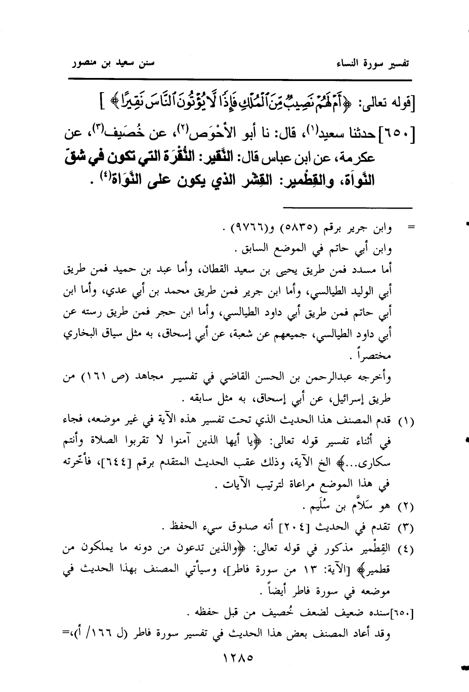 ٦٥٠ - حَدَّثَنَا سَعِيدٌ (¬١)، قَالَ: نا أَبُو الأحْوَص (¬٢)، عَنْ خُصَيف (¬٣)، عَنْ عِكْرِمَةَ، عَنِ ابْنِ عَبَّاسٍ قَالَ: النَّقير: النُّقْرَة الَّتِي تَكُونُ فِي شَقِّ النَّواة، والقِطْمير: القِشْر الَّذِي يَكُونُ على النَّوَاة (¬٤).