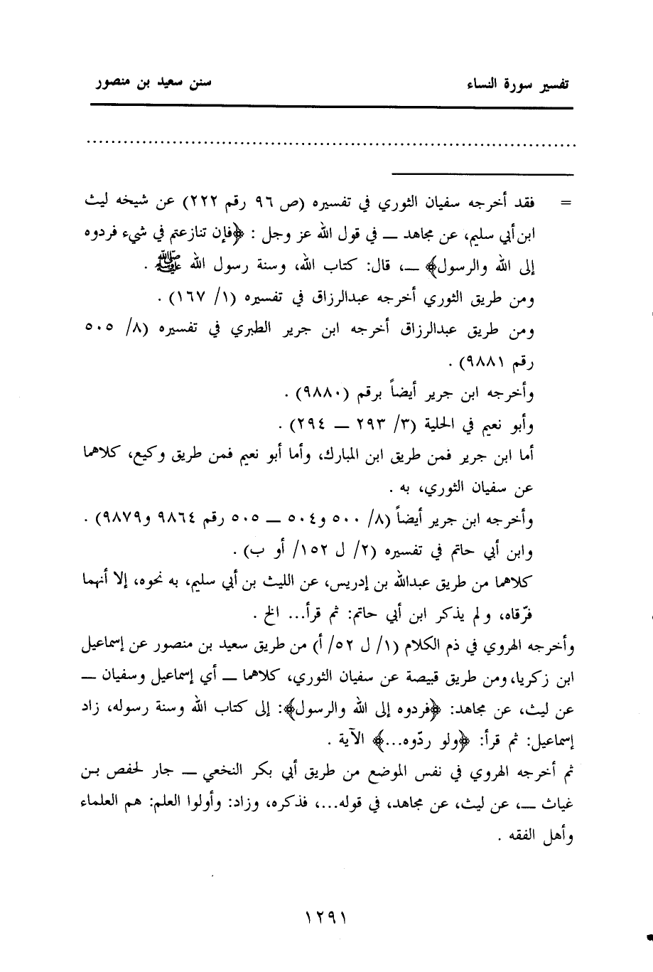 وأخرجه الهروي في "ذم الكلام" (١ / ل ٥٢ / أ) ، من طريق سعيد بن منصور عن إسماعيل بن زكريا، ومن طريق قبيصة عن سفيان الثوري، كلاهما - أي إسماعيل وسفيان - عن ليث، عن مجاهد: {فردوه إلى الله والرسول} : إلى كتاب الله وسنة رسوله، زاد إسماعيل: ثم قرأ: {ولو ردّوه ... } الآية.
