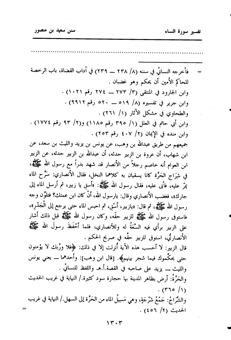 قال الزبير: لا أحسب هذه الآية أُنزلت إلا في ذلك {فَلَا وربِّك لَا يُؤْمِنُونَ حَتَّى يحكِّموك فيما شجر بينهم} . [قال ابن وهب] : وأحدهما - يعني يونس والليث - يزيد على صاحبه في القصة. أهـ. واللفظ للنسائي.