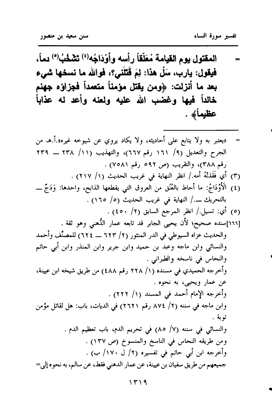= الْمَقْتُولُ يَوْمَ الْقِيَامَةِ مُعَلّقًا رَأْسَهُ وأوْدَاجُه (¬٤) تَشْخُبُ (¬٥) دَمًا، فَيَقُولُ: يَا رَبِّ سَلْ هَذَا: لِمَ قَتَلَني؟)) فوالله ما نسخها شيء بَعْدِ مَا أُنْزِلَتْ: {وَمَنْ يَقْتُلْ مُؤْمِنًا مُتَعَمِّدًا فَجَزَاؤُهُ جَهَنَّمُ خَالِدًا فِيهَا وَغَضِبَ اللَّهُ عَلَيْهِ وَلَعَنَهُ وأعد له عذابًا عظيمًا}.