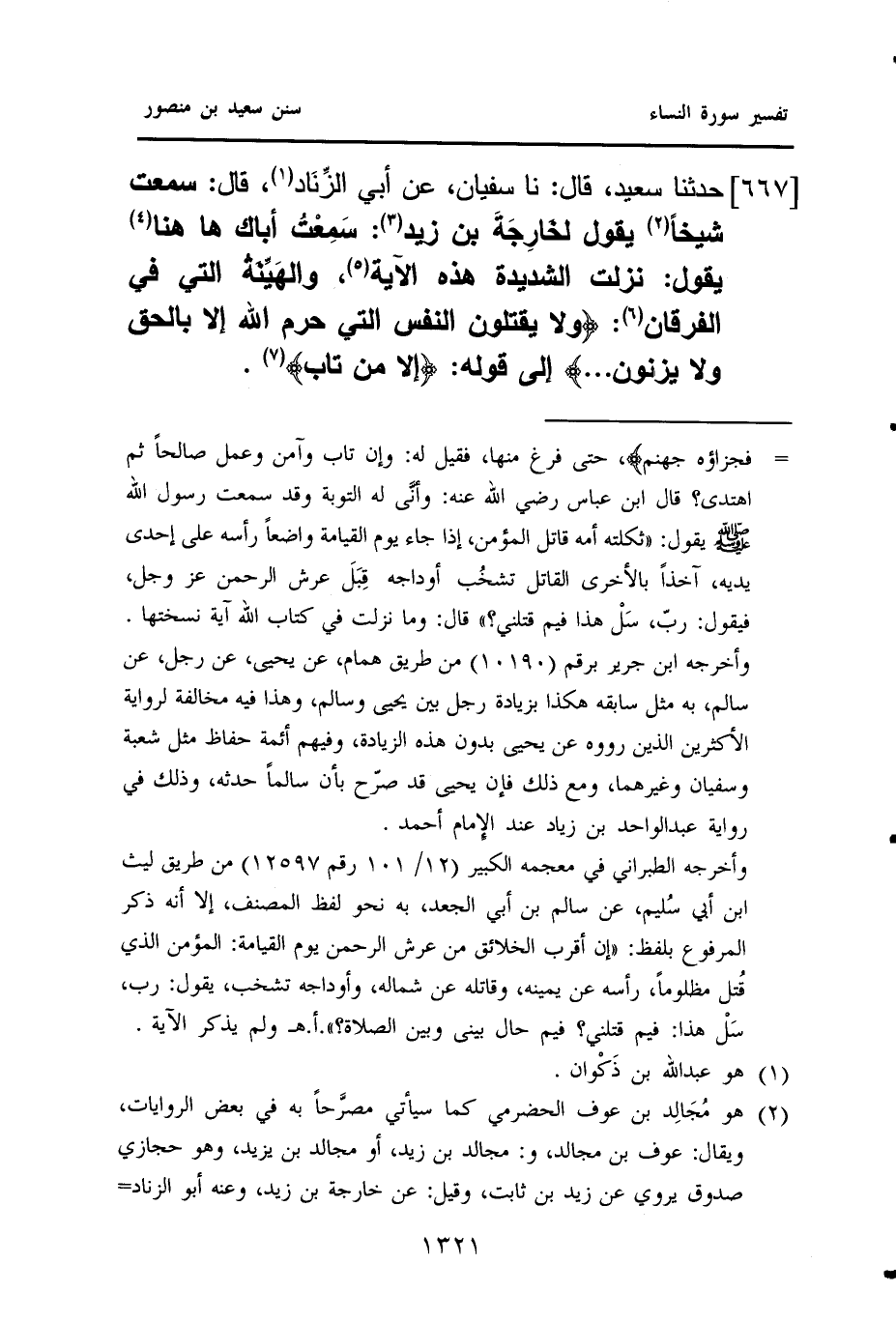 ٦٦٧ - حَدَّثَنَا سَعِيدٌ، قَالَ: نا سُفْيَانُ، عَنْ أَبِي الزِّنَاد (¬١)، قَالَ: سَمِعْتُ شَيْخًا (¬٢) يَقُولُ لخَارِجَةَ بْنِ زَيْدٍ (¬٣): سَمِعْتُ أَبَاكَ هَاهُنَا (¬٤) يَقُولُ: نَزَلَتِ الشَّدِيدَةُ هَذِهِ الْآيَةُ (¬٥)، والهَيِّنَةُ الَّتِي فِي الْفُرْقَانِ (¬٦): {وَلَا يَقْتُلُونَ النَّفْسَ الَّتِي حَرَّمَ اللَّهُ إِلَّا بِالْحَقِّ ولا يزنون ... } إِلَى قَوْلِهِ: {إِلَّا مَنْ تَابَ} (¬٧).