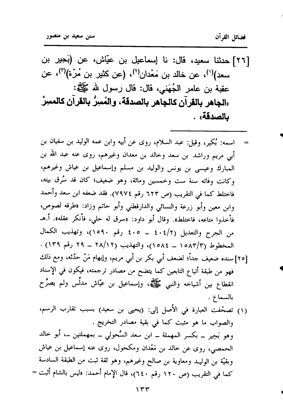 ٢٦ - حَدَّثَنَا سَعِيدٌ، قَالَ: نا إِسْمَاعِيلُ بْنُ عَيَّاشٍ، عَنْ (بَحِير بْنِ سَعْدٍ) (¬١)، عَنْ خَالِدِ بْنِ مَعْدان (¬٢)، (عَنْ كَثِيرِ بْنِ مُرّة) (¬٣)، عَنْ عُقْبَةَ بْنِ عَامِرٍ الجُهَني، قَالَ: قَالَ رَسُولُ اللَّهِ - صَلَّى اللهُ عَلَيْهِ وَسَلَّمَ -: ((الْجَاهِرُ بِالْقُرْآنِ كَالْجَاهِرِ بِالصَّدَقَةِ، والمُسِرُّ بِالْقُرْآنِ كالمسِرِّ بِالصَّدَقَةِ)).