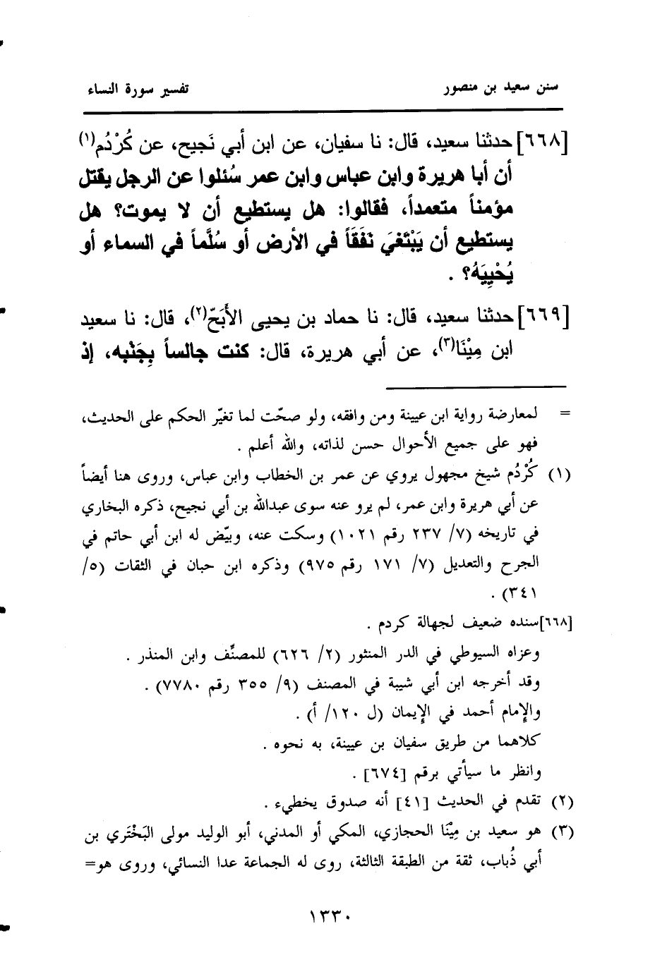 ٦٦٨ - حَدَّثَنَا سَعِيدٌ، قَالَ: نا سُفْيَانُ، عَنِ ابْنِ أَبِي نَجيح، عَنْ كُرْدُم (¬١)، أَنَّ أَبَا هُرَيْرَةَ وَابْنَ عَبَّاسٍ وَابْنَ عُمَرَ سُئلوا عَنِ الرَّجُلِ يَقْتُلُ مُؤْمِنًا مُتَعَمِّدًا، فَقَالُوا: هَلْ يَسْتَطِيعُ أَنْ لَا يَمُوتَ؟ هَلْ يَسْتَطِيعُ أَنْ يَبْتَغيَ نَفَقًا فِي الْأَرْضِ أَوْ سُلَّمًا فِي السَّمَاءِ أَوْ يُحْيِيَهُ؟.