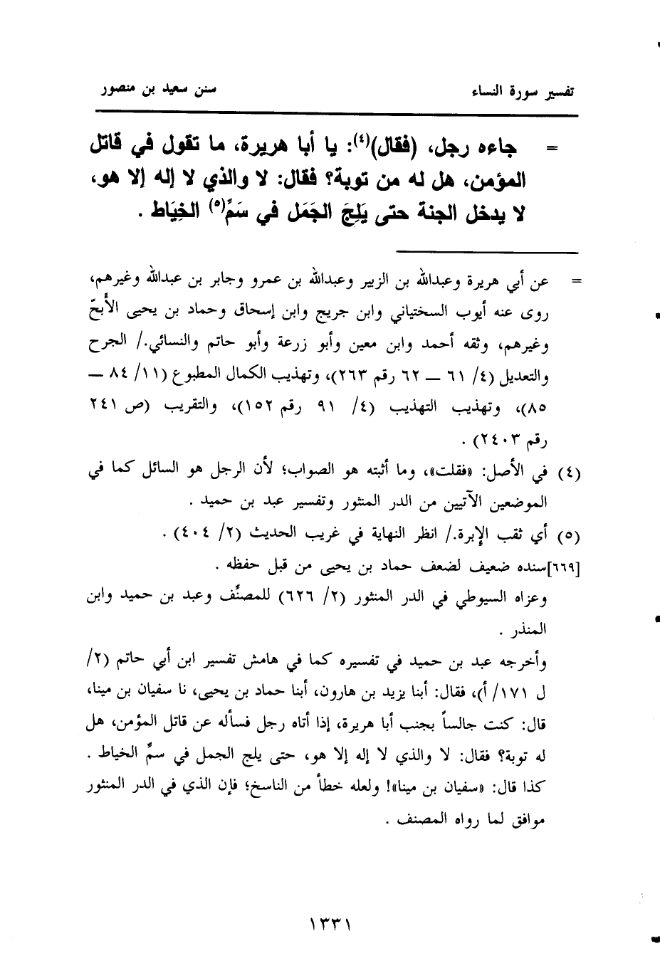 وأخرجه عبد بن حميد في "تفسيره" كما في هامش "تفسير ابن أبي حاتم" (٢ / ل ١٧١ / أ)، فقال: أبنا يزيد بن هارون، أبنا حماد بن يحيى، نا سفيان بن مينا، قال: كنت جالسًا بجنب أبا هريرة، إذا أتاه رجل فسأله عن قاتل المؤمن، هل له تَوْبَةٍ؟ فَقَالَ: لَا وَالَّذِي لَا إله إلا هو، حَتَّى يَلِجَ الْجَمَلُ فِي سمِّ الخياط. كذا قال ((سفيان بن مينا))! علله خطأ من الناسخ، فإن الذي في "الدر المنثور" موافق لما رواه المصنف.