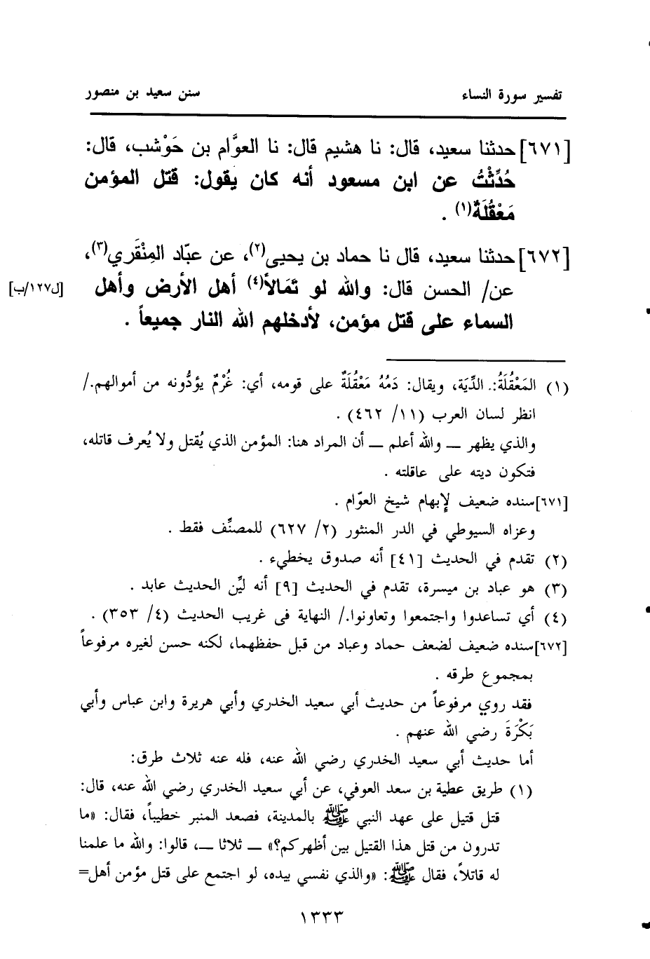٦٧١ - حَدَّثَنَا سَعِيدٌ، قَالَ: نا هُشَيْمٌ قَالَ: نا العوَّام بْنُ حَوْشب، قَالَ: حُدِّثْتُ عَنِ ابْنِ مَسْعُودٍ أَنَّهُ كَانَ يَقُولُ: قَتْلُ الْمُؤْمِنِ مَعْقُلَة (¬١).