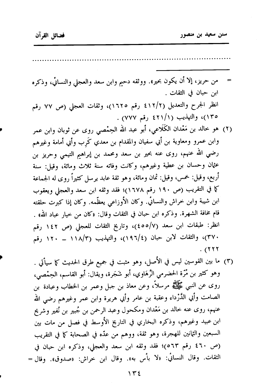 (¬٢) هو خالد بن مَعْدان الكَلَاعي، أبو عبد الله الحِمْصي روى عن ثوبان وابن عمر وابن عمرو ومعاوية بن أبي سفيان والمقدام بن معدي كَرِب وأبي أمامة وغيرهم - رضي الله عنهم -، روى عنهم بحير بن سعد ومحمد بن إبراهيم التيمي وحريز بن عثمان وحسان بن عطية وغيرهم، وكانت وفاته سنة ثلاث ومائة، وقيل: سنة أربع، وقيل: خمس، وقيل: ثمان ومائة، وهو ثقة عابد يرسل كثيرًا روى له الجماعة كما في "التقريب" (ص ١٩٠ رقم ١٦٧٨)؛ فقد وثقه ابن سعد والعجلي ويعقوب بن شيبة وابن خراش والنسائي، وكان الأوزاعي يعظّمه، وكان إذا كبرت حلقته قام مخافة الشهرة. وذكره ابن حبان في "الثقات" وقال: ((كان من خيار عباد الله)).