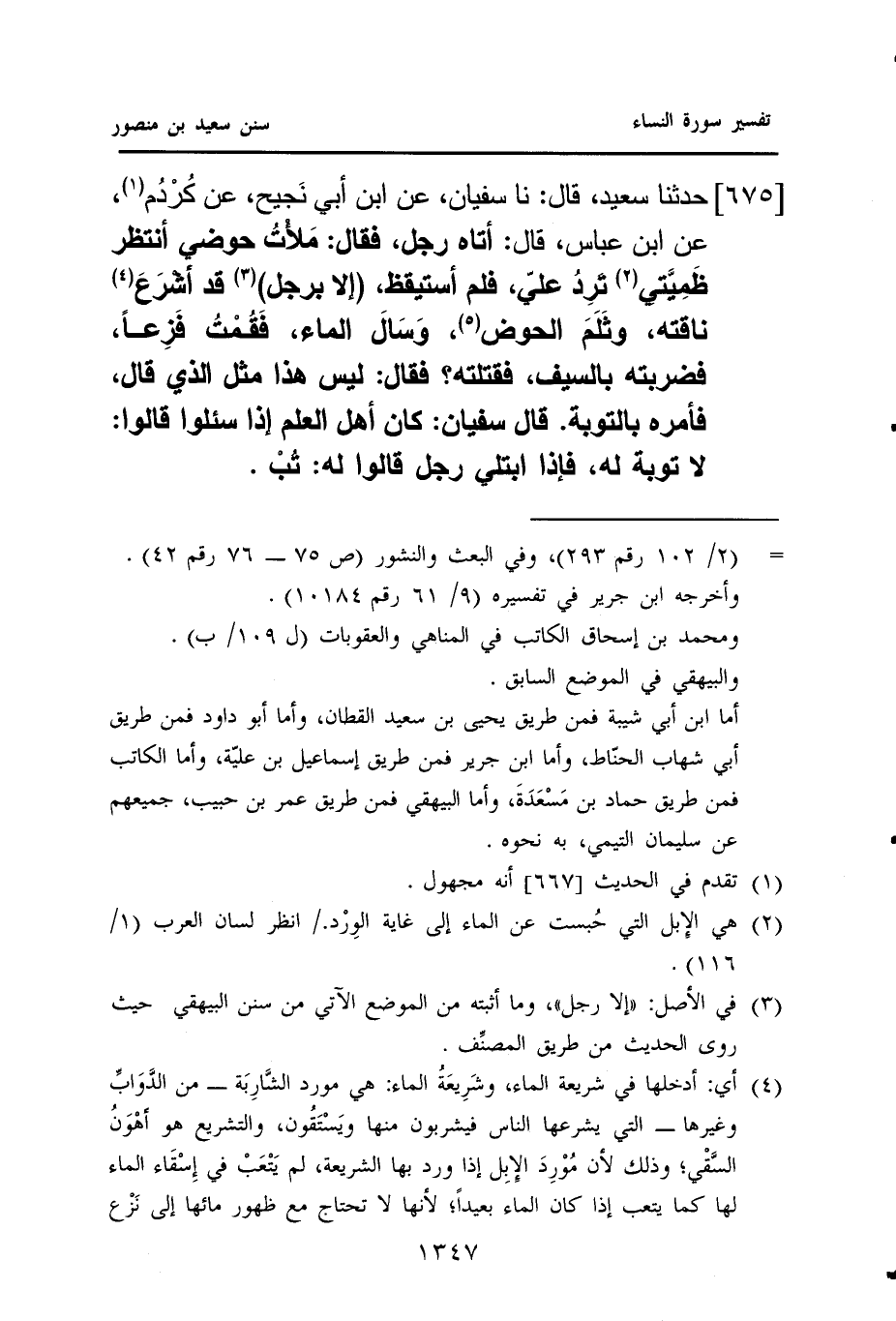 ٦٧٥ - حَدَّثَنَا سَعِيدٌ، قَالَ: نا سُفْيَانُ، عَنِ ابْنِ أَبِي نَجيح، عَنْ كُرْدُم (¬١)، عَنِ ابْنِ عَبَّاسٍ قَالَ: أَتَاهُ رَجُلٌ، فَقَالَ: مَلأْتُ حَوْضِي أَنْتَظِرُ ظَمِيَّتي (¬٢) تَرِدُ عَلَيَّ، فَلَمْ أَسْتَيْقِظْ، (إِلَّا بِرَجُلٍ) (¬٣) قَدْ أشْرَعَ (¬٤) نَاقَتَهُ، وثَلَمَ الْحَوْضَ (¬٥)، وَسَالَ الْمَاءُ، فَقُمْتُ فَزِعًا، فَضَرَبْتُهُ بِالسَّيْفِ، فَقَتَلْتُهُ؟ فَقَالَ: لَيْسَ هَذَا مِثْلَ الَّذِي قَالَ، فَأَمَرَهُ بِالتَّوْبَةِ. قَالَ سُفْيَانُ: كَانَ أَهْلُ الْعِلْمِ إِذَا سُئِلُوا قَالُوا: لَا تَوْبَةَ لَهُ، فَإِذَا ابْتُلِيَ رَجُلٌ قَالُوا لَهُ: تُبْ.