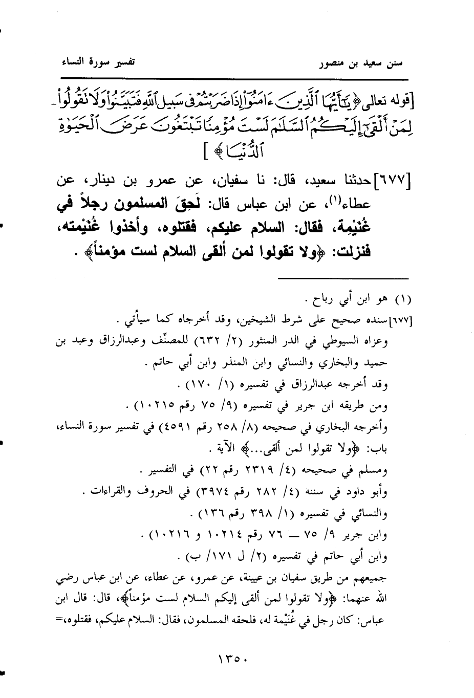 ٦٧٧ - حَدَّثَنَا سَعِيدٌ، قَالَ: نا سُفْيَانُ، عَنْ عَمْرِو بْنِ دِينَارٍ، عَنْ عَطَاءٍ (¬١)، عَنِ ابْنِ عَبَّاسٍ قَالَ: لَحِقَ الْمُسْلِمُونَ رَجُلًا فِي غُنَيْمِة، فَقَالَ: السَّلَامُ عَلَيْكُمْ، فَقَتَلُوهُ، وَأَخَذُوا غُنَيْمته، فَنَزَلَتْ: {وَلَا تَقُولُوا لِمَنْ أَلْقَى إِلَيْكُمُ السَّلَامَ لَسْتَ مؤمنًا}.