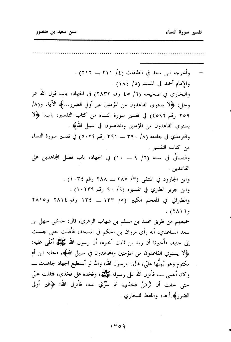 والبخاري في "صحيحه" (٦ / ٤٥ رقم ٢٨٣٢) في الجهاد، باب قول الله عز وجل: {لَا يَسْتَوِي الْقَاعِدُونَ مِنَ الْمُؤْمِنِينَ غير أولي الضرر ... } الآية، و (٨ / ٢٥٩ رقم ٤٥٩٢) في تفسير سورة النساء من كتاب التفسير، باب: {لَا يَسْتَوِي الْقَاعِدُونَ مِنَ الْمُؤْمِنِينَ والمجاهدون في سبيل الله} .
