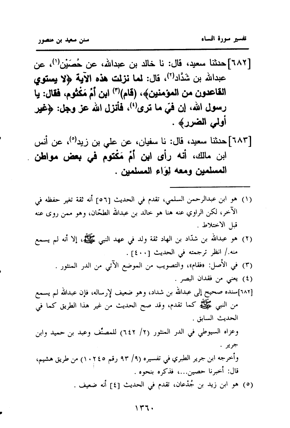 ٦٨٢ - حَدَّثَنَا سَعِيدٌ، قَالَ: نا خَالِدُ بْنُ عَبْدِ اللَّهِ، عَنْ حُصَيْن (¬١)، عَنْ عَبْدِ اللَّهِ بْنِ شَدَّاد (¬٢)، قَالَ: لَمَّا نَزَلَتْ هَذِهِ الْآيَةُ: {لَا يَسْتَوِي الْقَاعِدُونَ مِنَ الْمُؤْمِنِينَ}، (قَامَ) (¬٣) ابْنُ أمِّ مَكْتُوم فَقَالَ: يَا رَسُولَ اللَّهِ، إِنَّ فِيَّ مَا تَرَى (¬٤)، فَأَنْزَلَ اللَّهُ عَزَّ وجل: {غير أولي الضرر}.