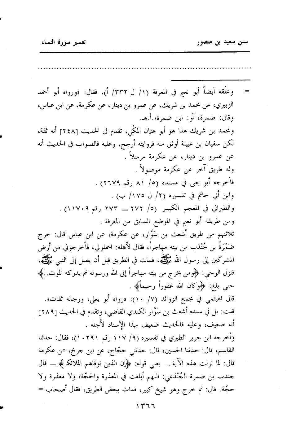 ثلاثتهم من طريق أشعث بن سَوَّار، عَنْ عِكْرِمَةَ، عَنِ ابْنِ عَبَّاسٍ قال: خرج ضَمْرَةُ بن جُنْدَب من بيته مهاجرًا، فقال لأهله: احملوني، فأخرجوني من أرض المشركين إِلَى رَسُولِ اللَّهِ - صَلَّى اللهُ عليه وسلم -، فمات في الطريق قبل أن يصل إِلَى النَّبِيِّ - صَلَّى اللهُ عَلَيْهِ وسلم -، فنزل الوحي: {وَمَنْ يَخْرُجْ مِنْ بَيْتِهِ مُهَاجِرًا إِلَى اللهِ وَرَسُولِهِ ثُمَّ يُدْرِكْهُ المَوْتُ ... } حتى بلغ: {وكان الله غفورًا رحيمًا} .