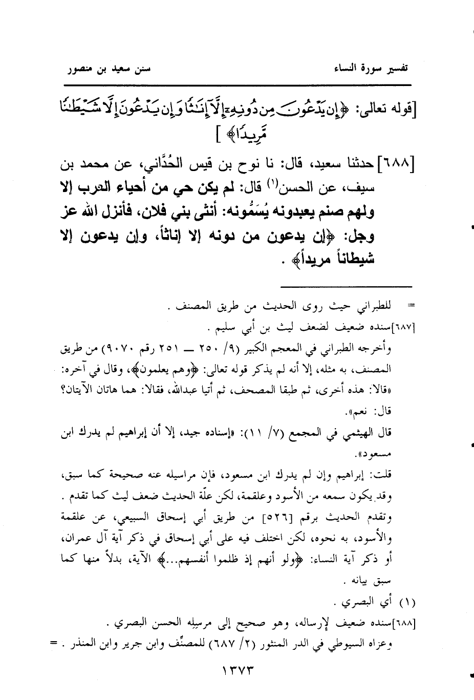 ٦٨٨ - حَدَّثَنَا سَعِيدٌ، قَالَ: نا نُوحُ بْنُ قَيْسٍ الحُدَّاني، عَنْ مُحَمَّدِ بْنِ سَيْفٍ، عَنِ الْحَسَنِ (¬١) قَالَ: لَمْ يَكُنْ حَيٌّ مِنْ أَحْيَاءِ الْعَرَبِ إِلَّا وَلَهُمْ صَنَمٌ يَعْبُدُونَهُ يُسَمُّونه: أُنْثَى بَنِي فُلَانٍ، فَأَنْزَلَ اللَّهُ عَزَّ وَجَلَّ: {إِنْ يَدْعُونَ مِنْ دُونِهِ إِلَّا إِنَاثًا وَإِنْ يدعون إلا شيطانًا مريدًا}.