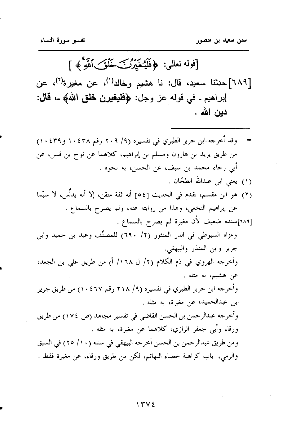 ٦٨٩ - حَدَّثَنَا سَعِيدٌ، قَالَ: نا هُشَيْمٌ وَخَالِدٌ (¬١)، عَنْ مُغِيرَةَ (¬٢)، عَنْ إِبْرَاهِيمَ - فِي قَوْلِهِ عَزَّ وَجَلَّ: {فَلَيُغَيِّرُنَّ خلق الله} - قال: دين الله.