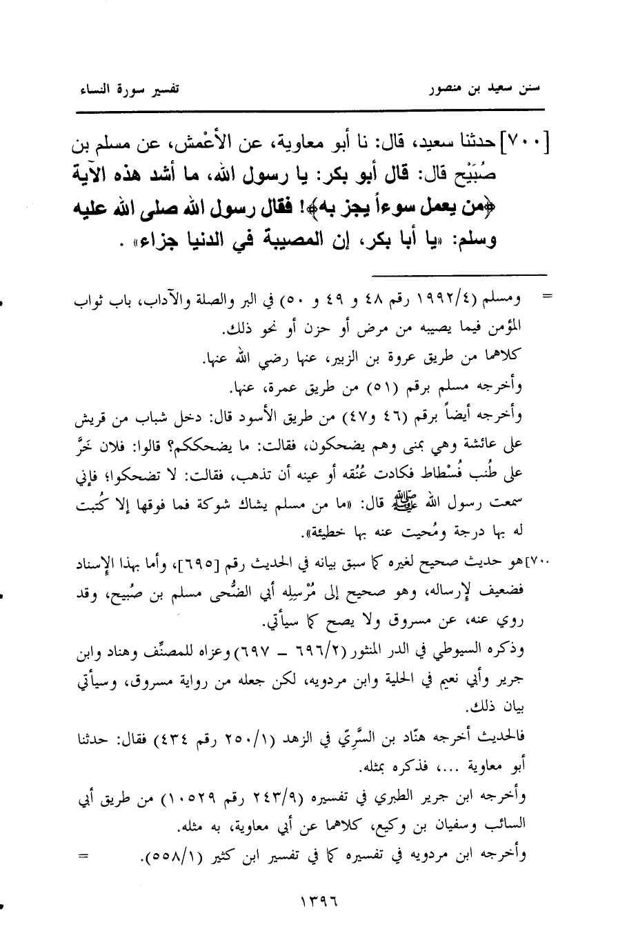 ٧٠٠- حَدَّثَنَا سَعِيدٌ، قَالَ: نا أَبُو مُعَاوِيَةَ، عَنِ الأعْمش، عَنْ مُسْلِمِ بْنِ صُبَيْح قَالَ: قَالَ أَبُو بَكْرٍ: يَا رَسُولَ اللَّهِ، مَا أَشَدَّ هَذِهِ الْآيَةَ {مَنْ يَعْمَلْ سوءًا يجز به} ! فَقَالَ رَسُولُ اللَّهِ صَلَّى اللهُ عَلَيْهِ وَسَلَّمَ: ((يَا أَبَا بَكْرٍ، إِنَّ الْمُصِيبَةَ فِي الدُّنْيَا جَزَاءٌ)) .