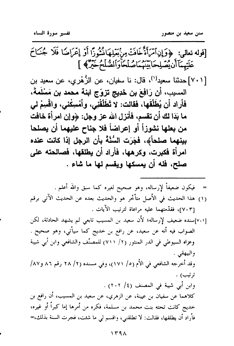 ٧٠١ - حَدَّثَنَا سَعِيدٌ (¬١)، قَالَ: نا سُفْيَانُ، عَنِ الزُّهْري، عَنْ سَعِيدِ بْنِ الْمُسَيِّبِ، أَنَّ رَافِعَ بْنَ خَدِيج تَزَوَّجَ ابْنَةَ مُحَمَّدِ بْنِ مَسْلَمَة، فَأَرَادَ أَنْ يُطَلِّقَها، فَقَالَتْ: لَا تُطَلِّقْنِي، وأمْسِكْني، واقْسِمْ لِي مَا بَدَا لَكَ أَنْ تُقْسِمَ، فَأَنْزَلَ اللَّهُ عَزَّ وَجَلَّ: {وَإِنْ امْرَأَةٌ خَافَتْ مِنْ بَعْلِهَا نُشُوزًا أَوْ إِعْرَاضًا فَلَا جُنَاحَ عَلَيْهِمَا أن يصلحا بينهما صلحًا}، فجَرَت السُّنَّةُ بِأَنَّ الرَّجُلَ إِذَا كَانَتْ عِنْدَهُ امْرَأَةٌ فَكَبُرَتْ، وَكَرِهَهَا، فَأَرَادَ أَنْ يُطَلِّقَهَا، فَصَالَحَتْهُ عَلَى صُلْحٍ، فَلَهُ أَنْ يُمْسِكَهَا وَيَقْسِمَ لها ما شاء.