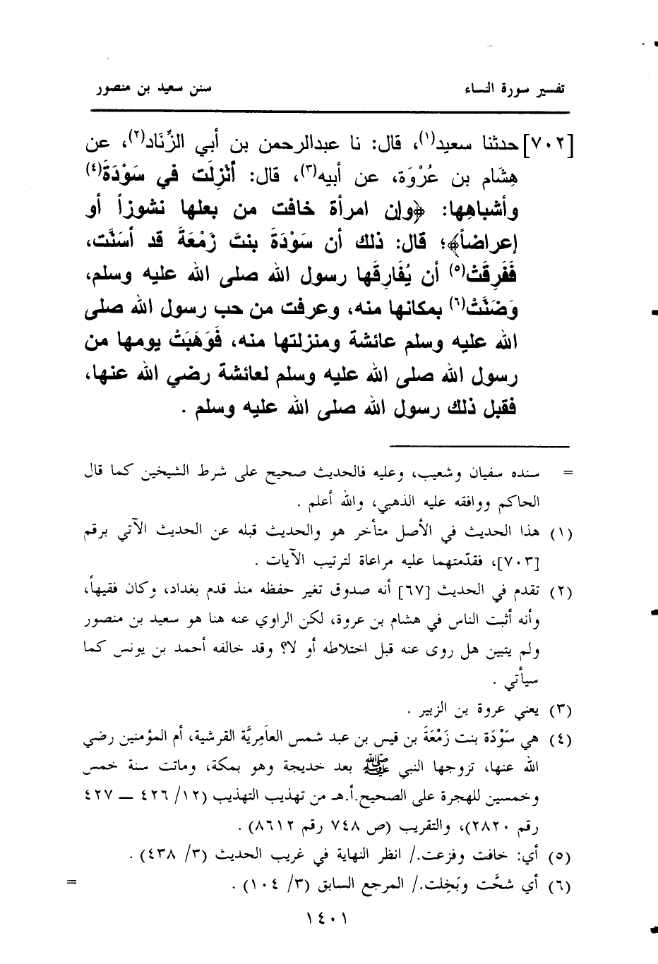٧٠٢ - حَدَّثَنَا سَعِيدٌ (¬١)، قَالَ: نا عَبْدُ الرَّحْمَنِ بْنُ أَبِي الزِّنَاد (¬٢)، عَنْ هِشَام بْنُ عُرْوَة، عَنْ أَبِيهِ (¬٣)، قَالَ أنْزِلَت فِي سَوْدَة (¬٤) وأشباهِها: {وَإِنِ امْرَأَةٌ خَافَتْ مِنْ بَعْلِهَا نشوزًا أو إعراضًا} قَالَ: ذَلِكَ أَنَّ سَوْدَةَ بنتَ زَمْعَةَ قَدْ أسَنَّت، فَفَرِقَتْ (¬٥) أَنْ يُفَارِقَها رَسُولُ اللَّهِ صَلَّى اللهُ عَلَيْهِ وَسَلَّمَ، وَضَنَّتْ (¬٦) بِمَكَانِهَا مِنْهُ، وَعَرَفَتْ مِنْ حُبِّ رَسُولِ اللَّهِ صَلَّى اللهُ عَلَيْهِ وَسَلَّمَ عَائِشَةَ، وَمَنْزِلَتِهَا مِنْهُ، فَوَهَبَتْ يَوْمَهَا مِنْ رَسُولُ اللَّهِ صَلَّى اللهُ عَلَيْهِ وَسَلَّمَ لِعَائِشَةَ رَضِي اللَّهُ عَنْهَا، فَقَبِلَ ذَلِكَ رَسُولُ اللَّهِ صَلَّى الله عليه وسلم.