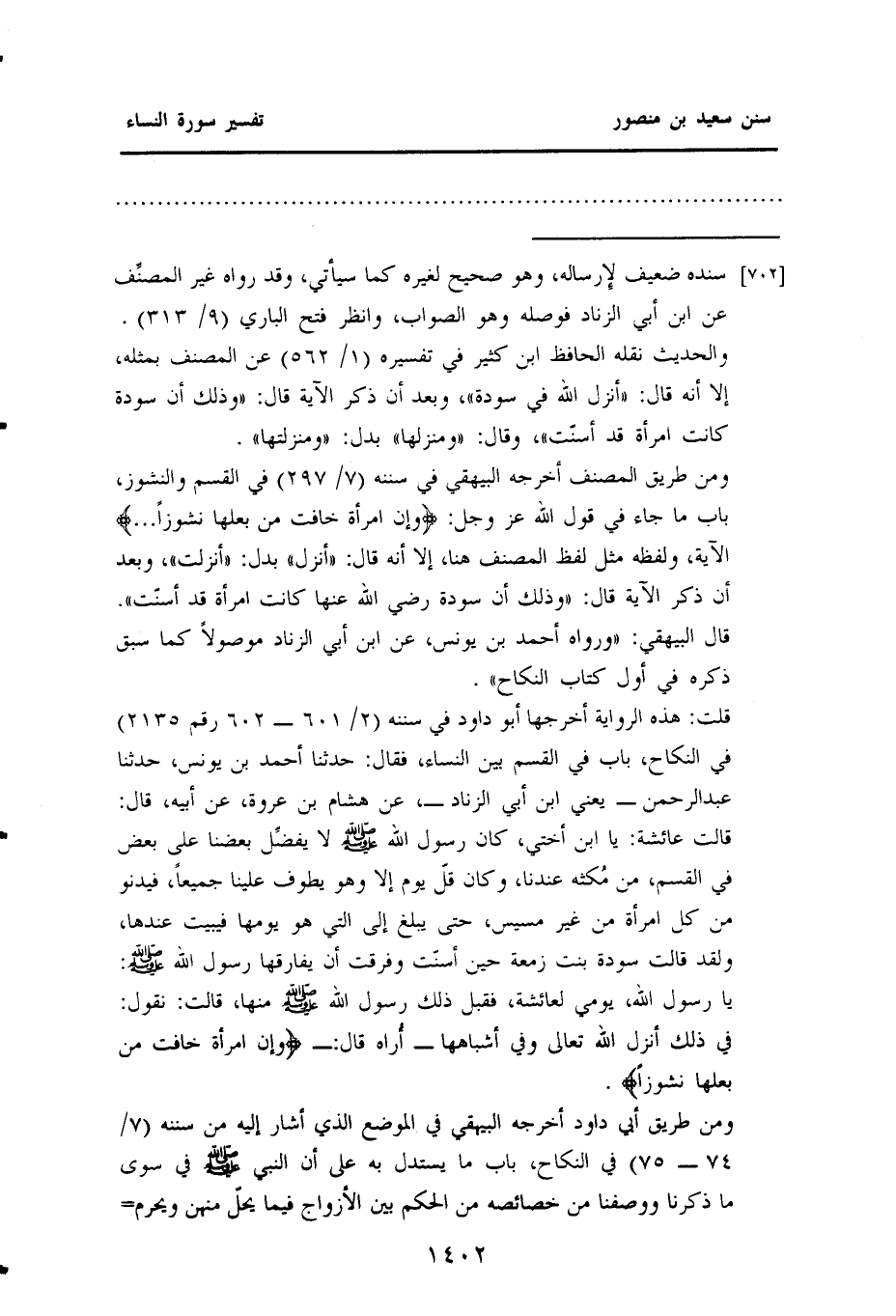 والحديث نقله الحافظ ابن كثير في "تفسيره" (١ / ٥٦٢) عن المصنف بمثله، إلا أنه قال: ((أنزل الله في سودة)) ، وبعد أن ذكر الآية قال: ((وذلك أن سودة كانت امرأة قد أسنّت)) ، وقال: ((ومنزلها)) ، بدل: ((ومنزلتها)) .