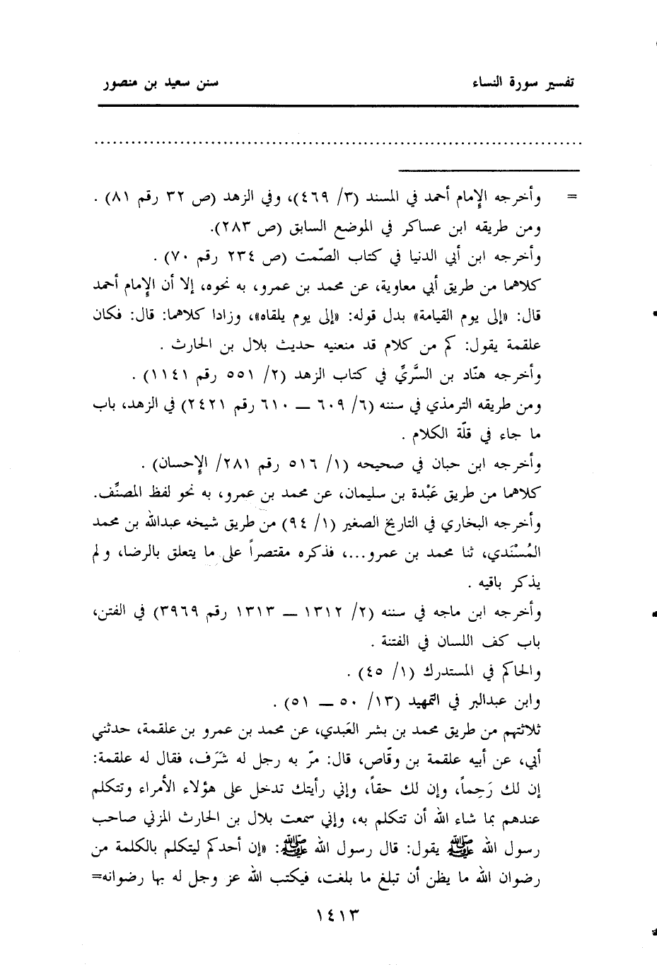 ثلاثتهم من طريق محمد بن بشر العَبدي، عَنْ مُحَمَّدِ بْنِ عَمْرِو بْنِ علقمة، حدثني أبي، عن أبيه علقمة بن وقّاص، قال: مرّ به رجل له شَرَف، فقال له علقمة: إن لك رَحِمًا، وإن لك حقًا، وإني رأيتك تدخل على هؤلاء الأمراء وتتكلم عندهم بما شاء الله أن تتكلم به، وإني سمعت بلال بن الحارث المزني صاحب رَسُولُ اللَّهِ - صَلَّى اللهُ عَلَيْهِ وسلم - يقول: قَالَ رَسُولُ اللَّهِ - صَلَّى اللهُ عليه وسلم -: ((إن أحدكم لتيكلم بالكلمة من رضوان اللَّهِ مَا يَظُنُّ أَنْ تَبْلُغَ ما بلغت، فيكتب الله عز وجل له بها رضوانه =
