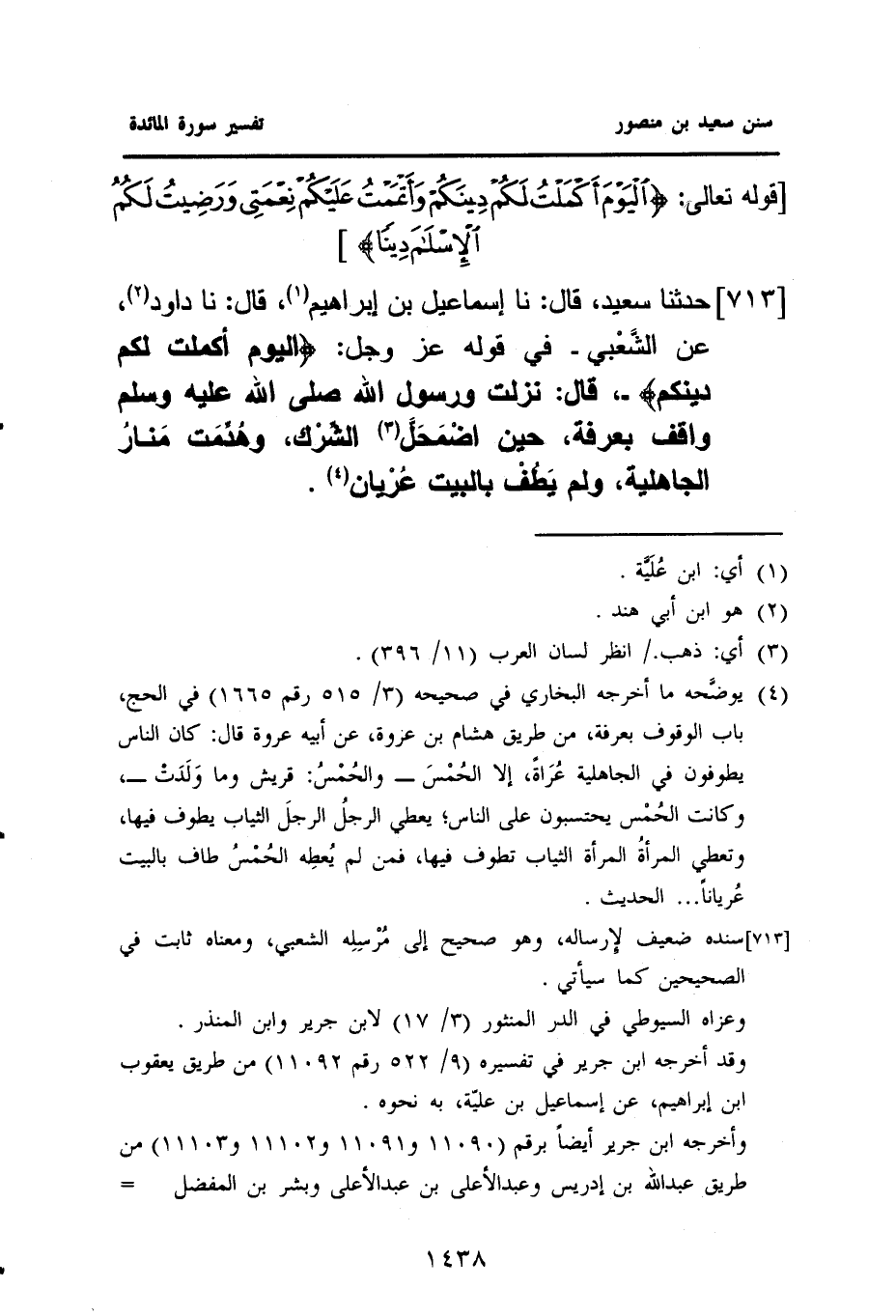 ٧١٣ - حَدَّثَنَا سَعِيدٌ، قَالَ: نا إِسْمَاعِيلُ بْنُ إِبْرَاهِيمَ (¬١)، قَالَ: نا دَاوُدُ (¬٢)، عَنِ الشَّعْبي - فِي قَوْلِهِ عَزَّ وَجَلَّ: {الْيَوْمَ أَكْمَلْتُ لَكُمْ دِينَكُمْ} - قَالَ: نَزَلَتْ وَرَسُولُ اللَّهِ صَلَّى اللهُ عَلَيْهِ وَسَلَّمَ وَاقِفٌ بِعَرَفَةَ، حِينَ اضْمَحَلَّ (¬٣) الشِّرْك، وهُدِّمِت مَنارُ الْجَاهِلِيَّةِ، وَلَمْ يَطُفْ بِالْبَيْتِ عُرْيان (¬٤).