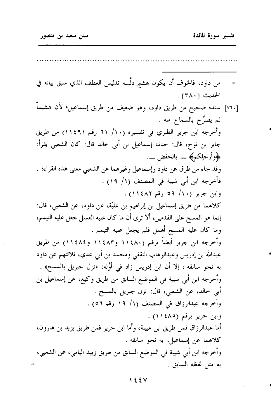 وأخرجه ابن جرير أيضًا برقم (١١٤٨٠ و ١١٤٨٣ و ١١٤٨٤) من طريق عبد الله بن إدريس وعبد الوهاب الثقفي ومحمد بن أبي عدي، ثلاثتهم عن داود به نحو سابقه، إلا أن ابن إدريس زاد في أوَّله: ((نزل جبريل المسح)) .