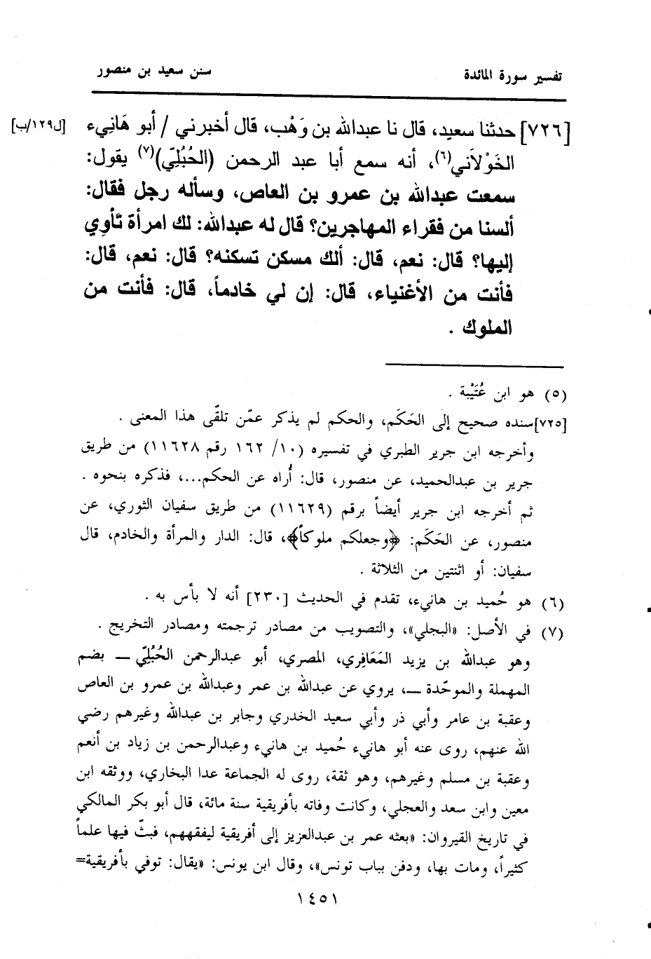 ٧٢٦ - حَدَّثَنَا سَعِيدٌ، قَالَ: نا عَبْدُ اللَّهِ بْنُ وَهْب قَالَ: أَخْبَرَنِي [ل ١٢٩/ب] أَبُو هَانِئ الخَوْلَاني (¬٦)، أَنَّهُ سَمِعَ أَبَا عَبْدِ الرَّحْمَنِ (الحُبُلِيّ) (¬٧) يَقُولُ: سَمِعْتُ عَبْدَ اللَّهِ بْنَ عَمْرِو بْنِ الْعَاصِ، وَسَأَلَهُ رَجُلٌ فَقَالَ: أَلَسْنَا مِنْ فُقَرَاءِ الْمُهَاجِرِينَ؟ قَالَ لَهُ عَبْدُ اللَّهِ: لَكَ امْرَأَةٌ تَأوِي إِلَيْهَا؟ قَالَ: نَعَمْ قَالَ: أَلَكَ مَسْكَنٌ تَسْكُنُهُ؟ قَالَ: نَعَمْ قَالَ: فَأَنْتَ مِنَ الْأَغْنِيَاءِ قَالَ: إِنَّ لِي خَادِمًا قَالَ: فَأَنْتَ من الملوك.