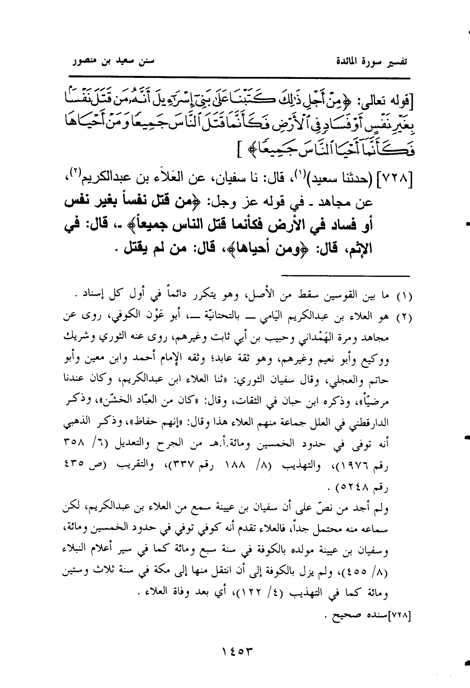 ٧٢٨ - (حَدَّثَنَا سَعِيدٌ) (¬١)، قَالَ: نَا سُفْيَانُ، عَنِ العَلَاء بْنِ عَبْدِ الْكَرِيمِ (¬٢)، عَنْ مُجَاهِدٍ - فِي قَوْلِهِ عَزَّ وَجَلَّ: {مَنْ قَتَلَ نَفْسًا بِغَيْرِ نَفْسٍ أَوْ فَسَادٍ فِي الْأَرْضِ فَكَأَنَّمَا قَتَلَ النَّاسَ جَمِيعًا} - قَالَ: فِي الْإِثْمِ، قَالَ: {وَمَنْ أحياها} قال: من لم يقتل.