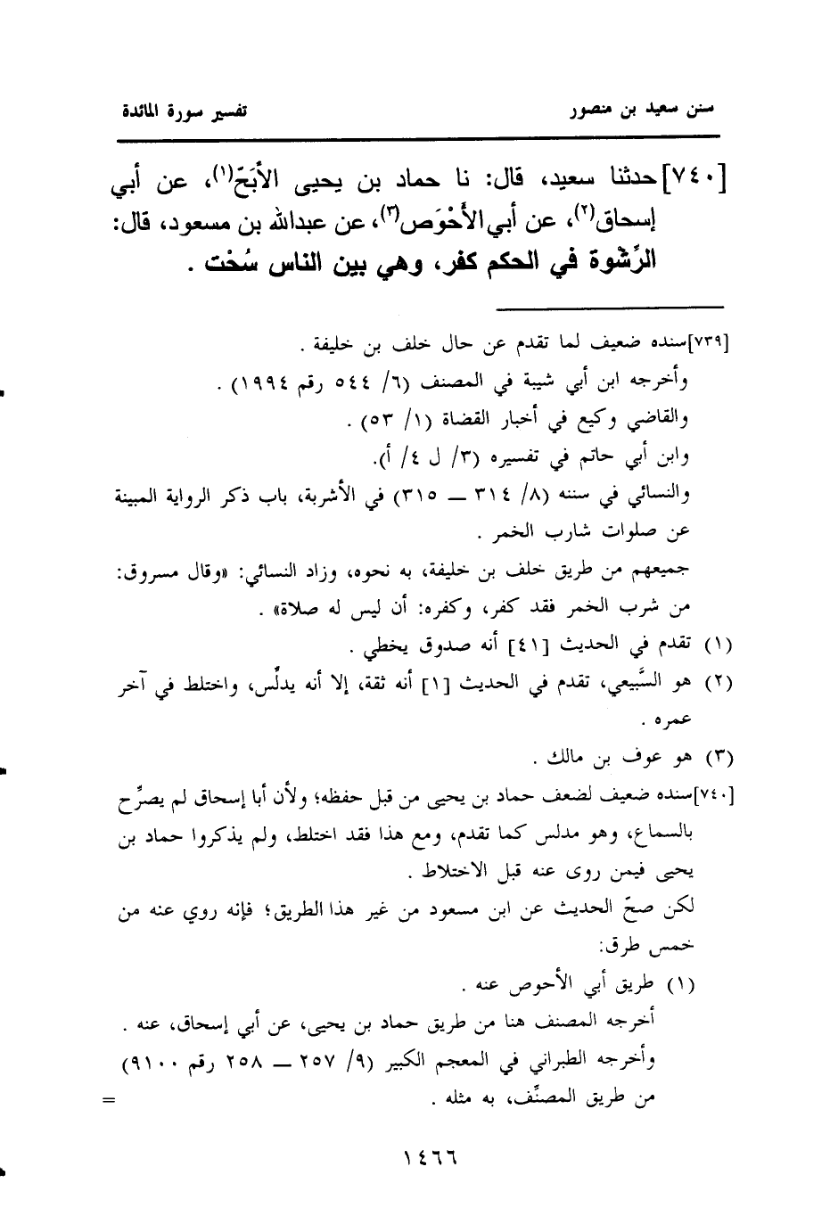 ٧٤٠ - حَدَّثَنَا سَعِيدٌ، قَالَ: نا حَمَّادُ بْنُ يَحْيَى الأبَحّ (¬١)، عَنْ أَبِي إِسْحَاقَ (¬٢)، عَنْ أَبِي الأحْوَص (¬٣)، عَنْ عَبْدِ اللَّهِ بْنِ مَسْعُودٍ قَالَ: الرِّشْوة فِي الْحُكْمِ كُفْرٌ، وَهِيَ بين الناس سُحْت.