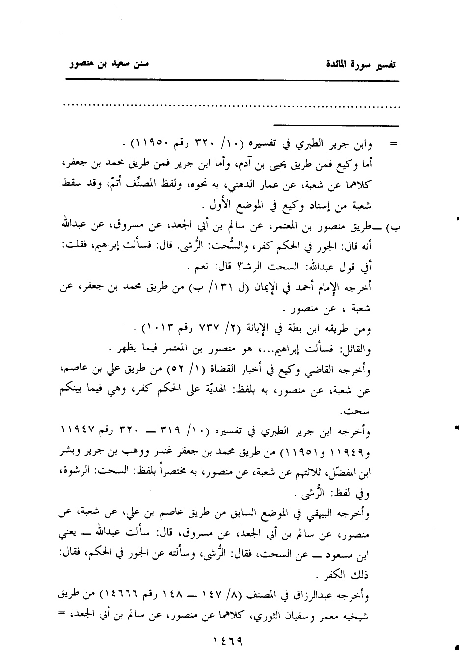 وأخرجه ابن جرير الطبري في "تفسيره" (١٠ / ٣١٩ - ٣٢٠ رقم ١١٩٤٧ و ١١٩٤٩ و ١١٩٥١) من طريق محمد بن جعفر غندر ووهب بن جرير وبشر بن المفضّل، ثلاثتهم عن شعبة، عن منصور، به مختصرًا بلفظ: السحت: الرشوة، وفي لفظ: الرُّشي.