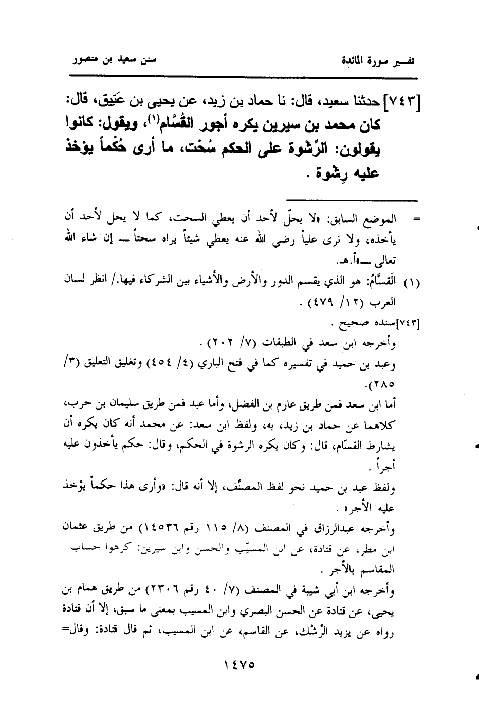 ٧٤٣ - حَدَّثَنَا سَعِيدٌ، قَالَ: نا حَمَّادُ بْنُ زَيْدٍ، عَنْ يَحْيَى بْنِ عَتِيق قَالَ: كَانَ مُحَمَّدُ بْنُ سِيرِينَ يَكْرَهُ أُجُورَ القُسَّام (¬١)، وَيَقُولُ: كَانُوا يَقُولُونَ: الرِّشْوة عَلَى الْحُكْمِ سُحْت، مَا أَرَى حُكْمًا يُؤْخَذُ عليه رِشْوة.