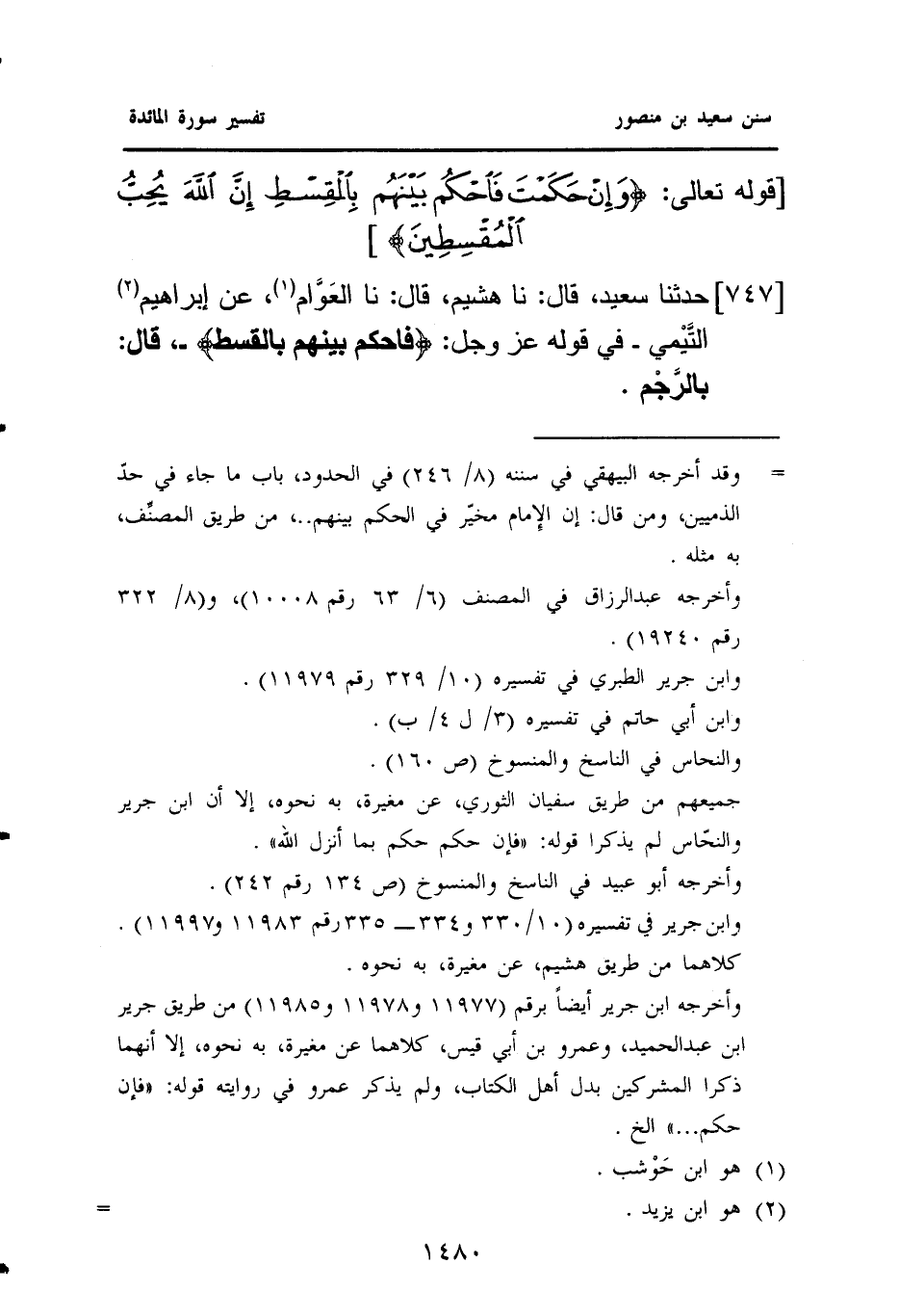 ٧٤٧ - حَدَّثَنَا سَعِيدٌ، قَالَ: نا هُشَيْمٌ، قَالَ: نا العَوَّام (¬١)، عَنْ إِبْرَاهِيمَ (¬٢) التَّيْمي - فِي قَوْلِهِ عَزَّ وَجَلَّ: {فاحكم بينهم بالقسط} -، قال: بالرَّجْم.