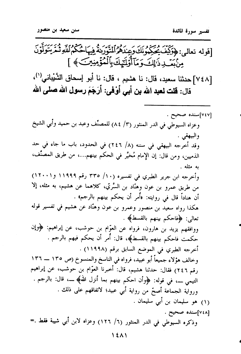 ٧٤٨ - حَدَّثَنَا سَعِيدٌ، قَالَ: نا هُشَيْمٌ، قَالَ: نا أَبُو إِسْحَاقَ الشَّيْباني (¬١)، قَالَ: قُلْتُ لِعَبْدِ اللَّهِ بْنِ أَبِي أَوْفى: أَرَجَمَ رَسُولُ اللَّهِ صلى الله
