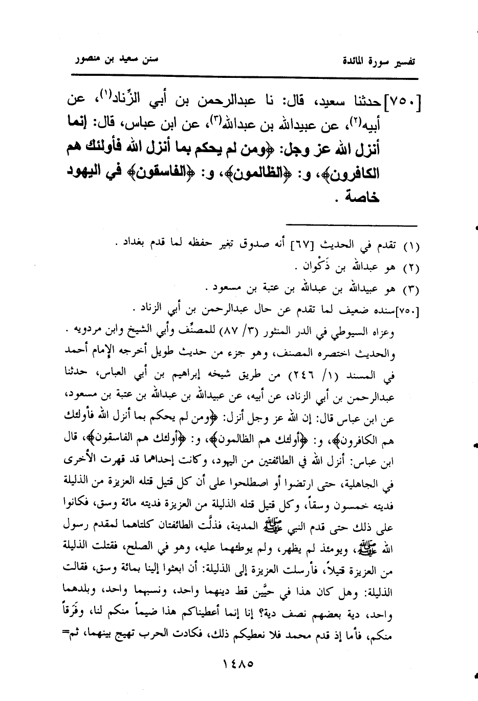 ٧٥٠ - حَدَّثَنَا سَعِيدٌ، قَالَ: نا عَبْدُ الرَّحْمَنِ بْنُ أَبِي الزِّناد (¬١)، عَنْ أَبِيهِ (¬٢)، عَنْ عُبَيْدِ اللَّهِ بْنِ عَبْدِ اللَّهِ (¬٣)، عَنِ ابْنِ عَبَّاسٍ قَالَ: إِنَّمَا أَنْزَلَ اللَّهُ عَزَّ وَجَلَّ: {وَمَنْ لَمْ يَحْكُمْ بِمَا أَنْزَلَ اللَّهُ فَأُولَئِكَ هُمُ الْكَافِرُونَ}، و: {الظالمون}، و: {الفاسقون} في اليهود خاصة.