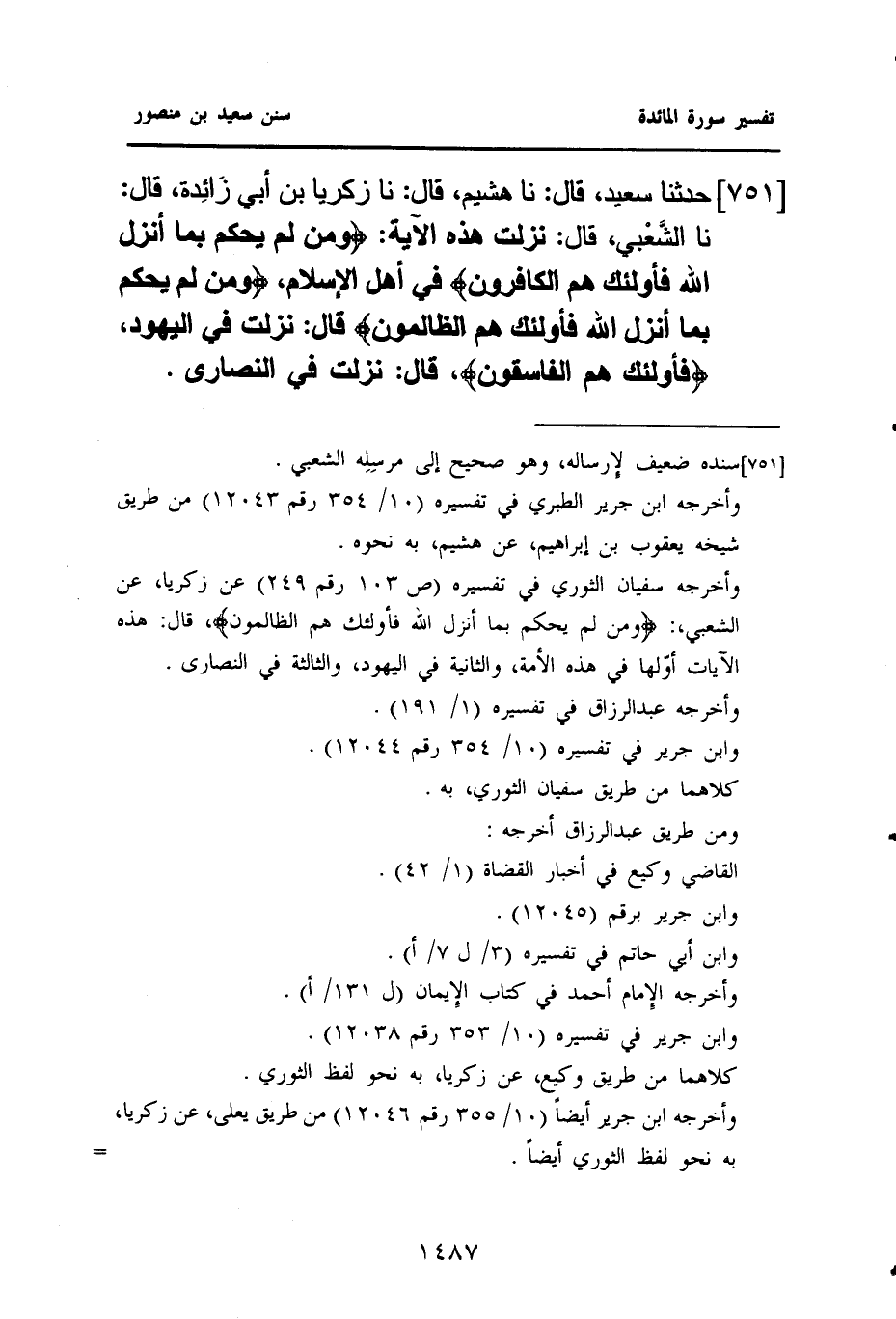 ٧٥١- حَدَّثَنَا سَعِيدٌ، قَالَ: نا هُشَيْمٌ قَالَ: نا زَكَرِيَّا بْنُ أَبِي زَائِدة، قَالَ: نا الشَّعْبي، قَالَ: نَزَلَتْ هَذِهِ الْآيَةُ: {وَمَنْ لَمْ يَحْكُمْ بِمَا أَنْزَلَ اللَّهُ فَأُولَئِكَ هم الكافرون} فِي أَهْلِ الْإِسْلَامِ، {وَمَنْ لَمْ يَحْكُمْ بِمَا أَنْزَلَ اللَّهُ فَأُولَئِكَ هم الظالمون} قَالَ: نَزَلَتْ فِي الْيَهُودِ، {فَأُولَئِكَ هم الفاسقون} ، قال: نزلت في النصارى.
