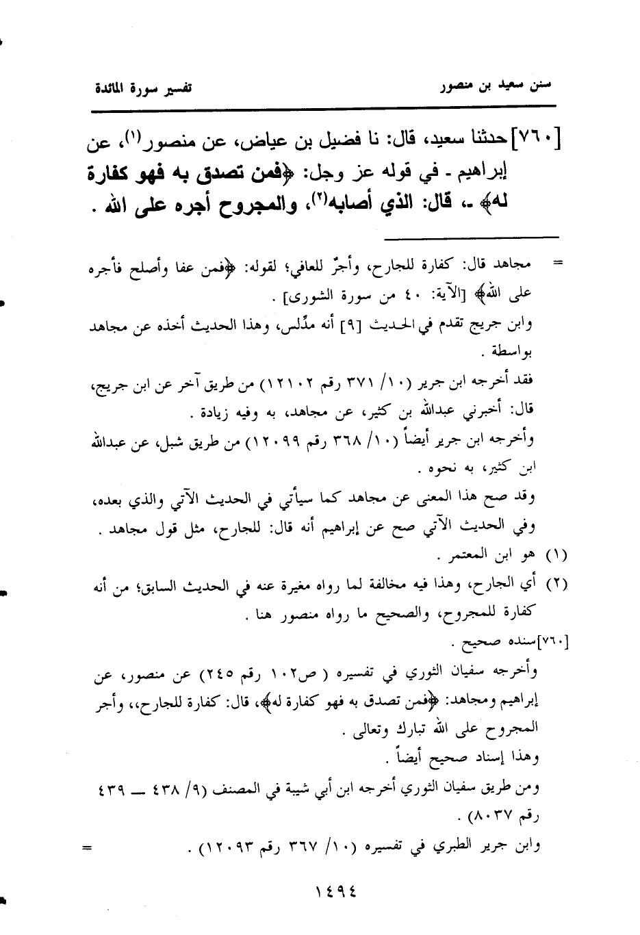 ٧٦٠ - حَدَّثَنَا سَعِيدٌ، قَالَ: نا فُضَيْلٌ بْنُ عِيَاضٍ، عَنْ مَنْصُورٍ (¬١)، عَنْ إِبْرَاهِيمَ - فِي قَوْلِهِ عَزَّ وَجَلَّ: {فَمَنْ تَصَدَّقَ بِهِ فَهُوَ كَفَّارَةٌ له} - قَالَ: الَّذِي أَصَابَهُ (¬٢)، وَالْمَجْرُوحُ أَجْرُهُ على الله.