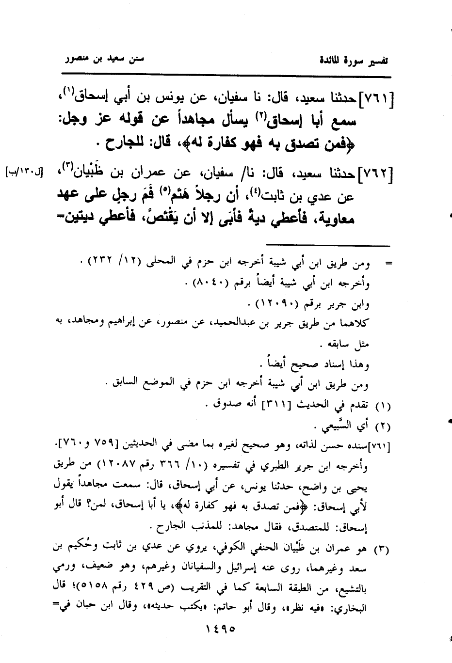 ٧٦١ - حَدَّثَنَا سَعِيدٌ، قَالَ: نا سُفْيَانُ، عَنْ يُونُسَ بْنِ أَبِي إِسْحَاقَ (¬١)، سَمِعَ أَبَا إِسْحَاقَ (¬٢) يَسْأَلُ مُجَاهِدًا، عَنْ قَوْلِهِ عَزَّ وَجَلَّ: {فَمَنْ تَصَدَّقَ بِهِ فَهُوَ كَفَّارَةٌ لَهُ} قَالَ: لِلْجَارِحِ.