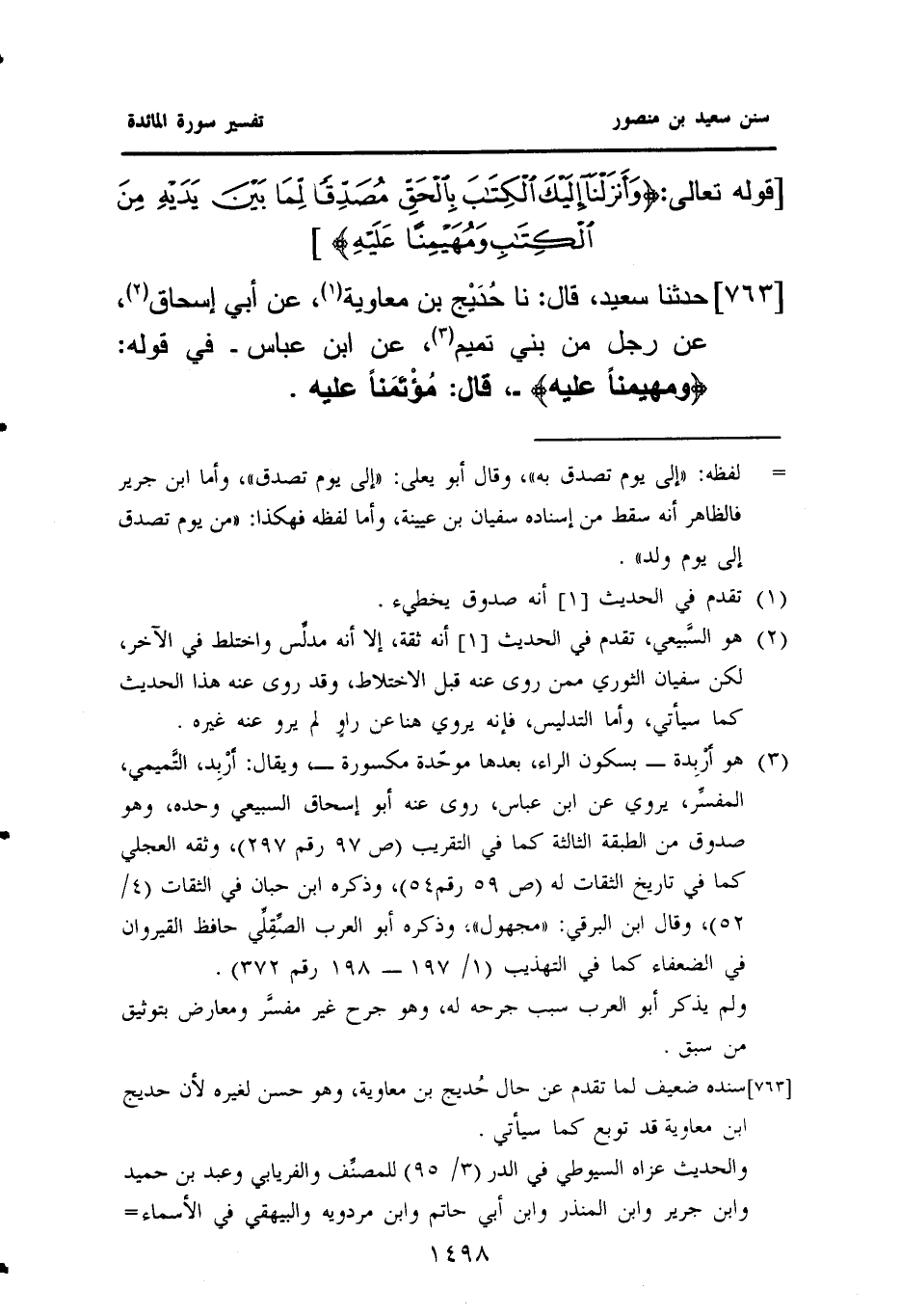 ٧٦٣ - حَدَّثَنَا سَعِيدٌ، قَالَ: نا حُدَيْج بنُ مُعَاوِيَةَ (¬١)، عَنْ أَبِي إِسْحَاقَ (¬٢)، عَنْ رَجُلٍ مِنْ بَنِي تَمِيمٍ (¬٣)، عَنِ ابْنِ عَبَّاسٍ - فِي قوله: {ومهيمنًا عليه} - قال: مُؤْتَمَنًا عليه.