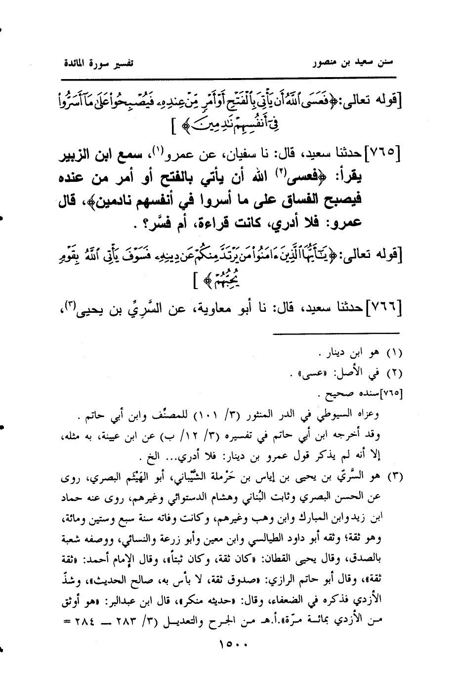 ٧٦٥ - حَدَّثَنَا سَعِيدٌ، قَالَ: نا سُفْيَانُ، عَنْ عَمْرٍو (¬١)، سَمِعَ ابْنَ الزُّبَيْرِ يَقْرَأُ: {فَعَسَى (¬٢) اللَّهُ أَنْ يَأْتِيَ بِالْفَتْحِ أَوْ أَمْرٍ مِنْ عِنْدِهِ فَيُصْبِحَ الْفُسَّاقُ عَلَى مَا أَسَرُّوا فِي أَنْفُسِهِمْ نَادِمِينَ}، قَالَ عَمْرٌو: فَلَا أَدْرِي كَانَتْ قِرَاءَةً، أَمْ فسَّر؟
