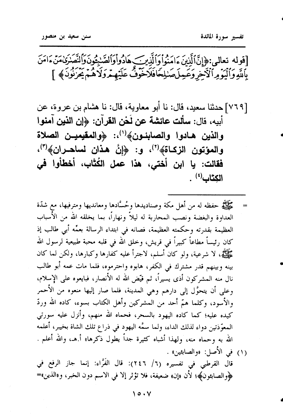 ٧٦٩ - حَدَّثَنَا سَعِيدٌ، قَالَ: نا أَبُو مُعَاوِيَةَ قَالَ: نا هِشَامُ بْنُ عُرْوَةَ، عَنْ أَبِيهِ، قَالَ: سَأَلْتُ عَائِشَةَ عَنْ لَحْن الْقُرْآنِ: {إِنَّ الَّذِينَ آمَنُوا وَالَّذِينَ هَادُوا وَالصَّابِئُونَ} (¬١)، {وَالْمُقِيمِينَ الصَّلَاةَ وَالْمُؤْتُونَ الزكاة} (¬٢)، وَ (إِنَّ هَذَانِ لَسَاحِرَانِ) (¬٣)، فَقَالَتْ: يَا ابْنَ أُخْتِي، هَذَا عَمَلُ الكُتَّاب، أخطأوا في الكِتَاب (¬٤).