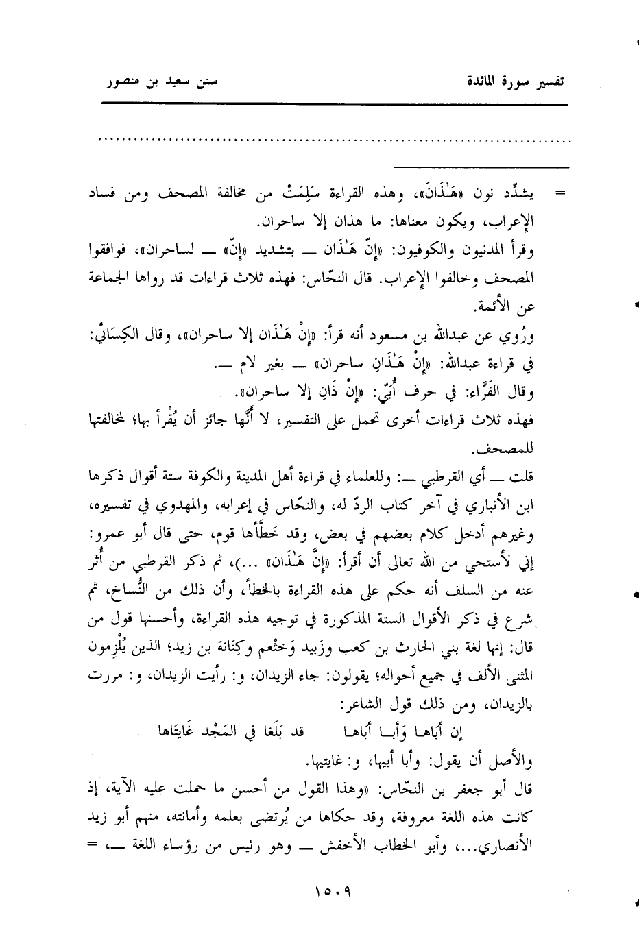 قلت - أي القرطبي -: وللعلماء في قراءة أهل المدينة والكوفة ستة أقوال ذكرها ابن الأنباري في آخر كتاب الردّ له، والنحّاس في إعرابه، والمهدوي في "تفسيره"، وغيرهم أدخل كلام بعضهم في بعض، وقد خَطَّأها قوم، حتى قال أبو عمرو: إني لأستحي من الله تعالى أن أقرأ: ((إِنَّ هَذَان)) ... ) ، ثم ذكر القرطبي من أُثر عنه من السلف أنه حكم على هذه القراءة بالخطأ، وأن ذلك من النُّساخ، ثم شرع في ذكر الأقوال الستة المذكورة في توجيه هذه القراءة، وأحسنها قول من قال: إنها لغة بني الحارث بن كعب وزَبيد وخَثْعم وكِنَانة بن زيد؛ الذين يُلْزِمون المثنى الألف في جميع أحواله؛ يقولون: جاء الزيدان، و: رأيت الزيدان، و: مررت بالزيدان، ومن ذلك قول الشاعر: