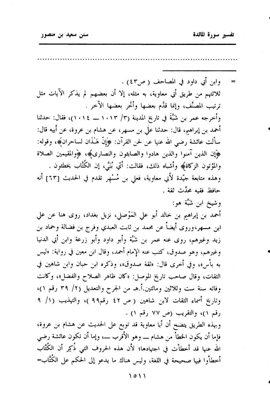 وأخرجه عمر بن شَبَّةَ في "تاريخ المدينة" (٣ / ١٠١٣ - ١٠١٤) ، فقال: حدثنا أحمد بن إبراهيم، قال: حدثنا علي بن مسهر، عَنْ هِشَامِ بْنِ عُرْوَةَ، عَنْ أبيه قال: سألت عائشة رضي الله عنها عن لحن القرآن: {إنّ هَذَان لساحران} ، وقوله: {إِنَّ الَّذِينَ آمَنُوا وَالَّذِينَ هَادُوا والصابئون والنصارى} ، {والمقيمين الصلاة والمؤتون الزكاة} وأشباه ذلك، فقالت: أيْ بُنَيَّ، إن الكُتَّاب يخطئون.