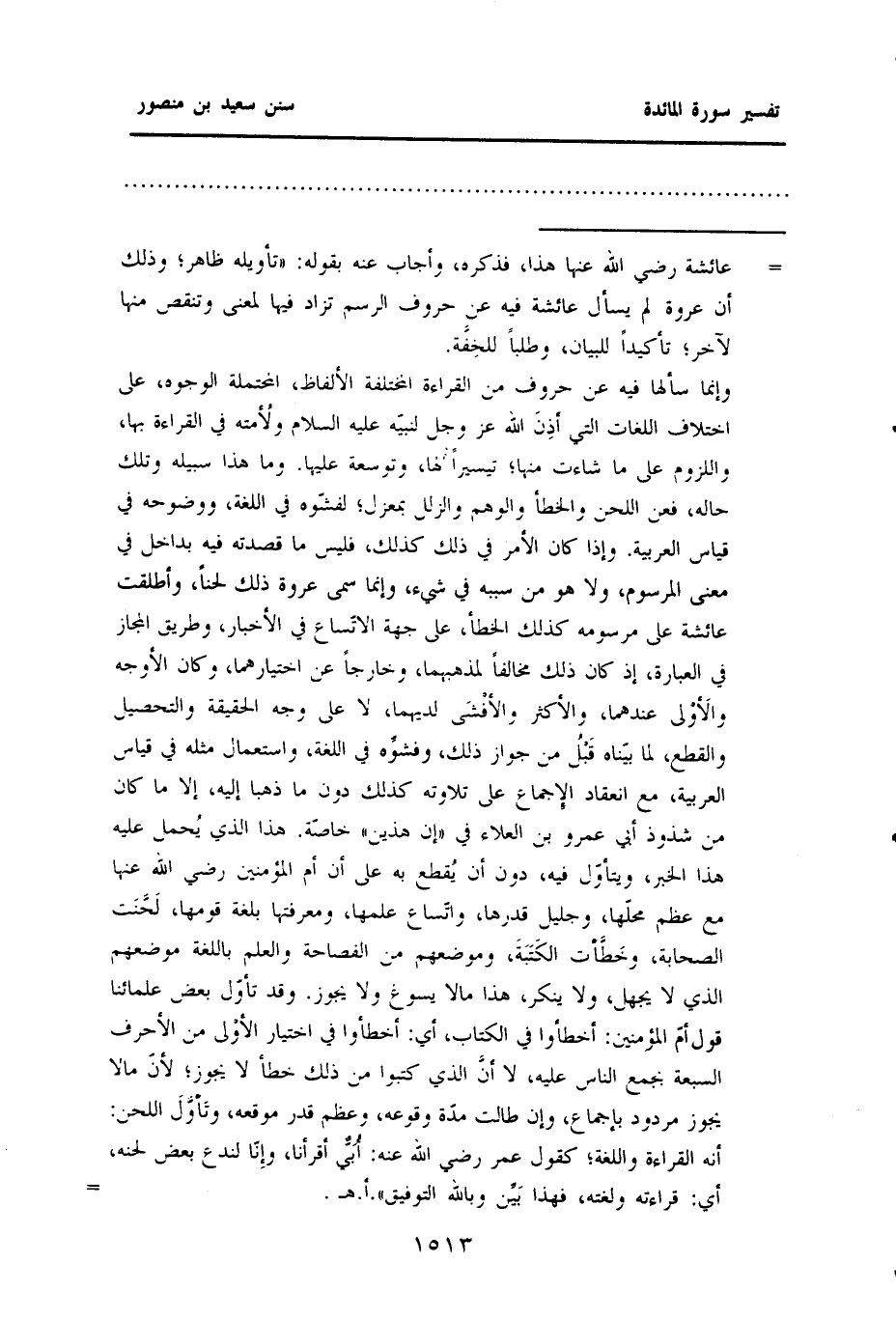 وإنما سألها فيه عن حروف من القراءة المختلفة الألفاظ، المحتملة الوجوه، على اختلاف اللغات التي أذِنَ الله عز وجل لنبيّه عليه السلام ولأُمته في القراءة بها، واللزوم على ما شاءت منها؛ تيسيرًا لها، وتوسعة عليها. وما هذا سبيله وتلك حاله، فعن اللحن والخطأ والوهم والزلل بمعزل؛ لفشّوه في اللغة، ووضوحه في قياس العربية. وإذا كان الأمر في ذلك كذلك، فليس ما قصدته فيه بداخل في معنى المرسوم، ولا هو من سببه في شيء، وإنما سمي عروة ذلك لحنًا، وأطلقت عائشة على مرسومه كذلك الخطأ، على جهة الاتّساع في الأخبار، وطريق المجاز في العبارة إذ كان ذلك مخالفا لمذهبهما، وخارجًا عن اختيارهما، وكان الأوجه والأَوْلى عندهما الأكثر والأفْشَى لديهما، لا على وجه الحقيقية والتحصيل والقطع لما بيّناه قَبْلُ من جواز ذلك وفشوِّه في اللغة، واستعمال مثله في قياس العربية، مع انعقاد الإجماع على تلاوته كذلك دون ما ذهبا إليه، إلا ما كان من شذوذ أبي عمرو بن العلاء في (إن هذين) خاصّة. هذا الذي يُحمل عليه هذا الخبر، ويتأوّل فيه، دون أن يُقطع به على أن أم المؤمنين رضي الله عنها مع عظيم محلّها، وجليل قدرها واتّساع علمها، ومعرفتها بلغة قومها، لَحَّنَت الصحابة وخَطَّأت الكَتَبَة، وموضعهم من الفصاحة والعلم باللغة موضعهم الذي لا يجهل، ولا ينكر، هذا مالا يسوغ ولا يجوز. وقد تأوّل بعض علمائنا قول أمّ المؤمنين: أخطأوا في الكتاب، أي: أخطأوا في اختيار الأوْلى من الأحرف السبعة بجمع الناس عليه، لا أنَّ الذي كتبوا من ذلك خطأ لا يجوز؛ لأنّ ما لا يجوز مردود بإجماع، وإن طالت مدّة وقوعه، وعظم قدر موقعه، وتَأوَّلَ اللحن: أنه القراءة واللغة؛ كقول عمر رضي الله عنه أُبَيٌّ أقرأنا، وإِناّ لندع بعض لحنه، أي: قراءته ولغته، فهذا بَيِّن وبالله التوفيق)) . اهـ. =