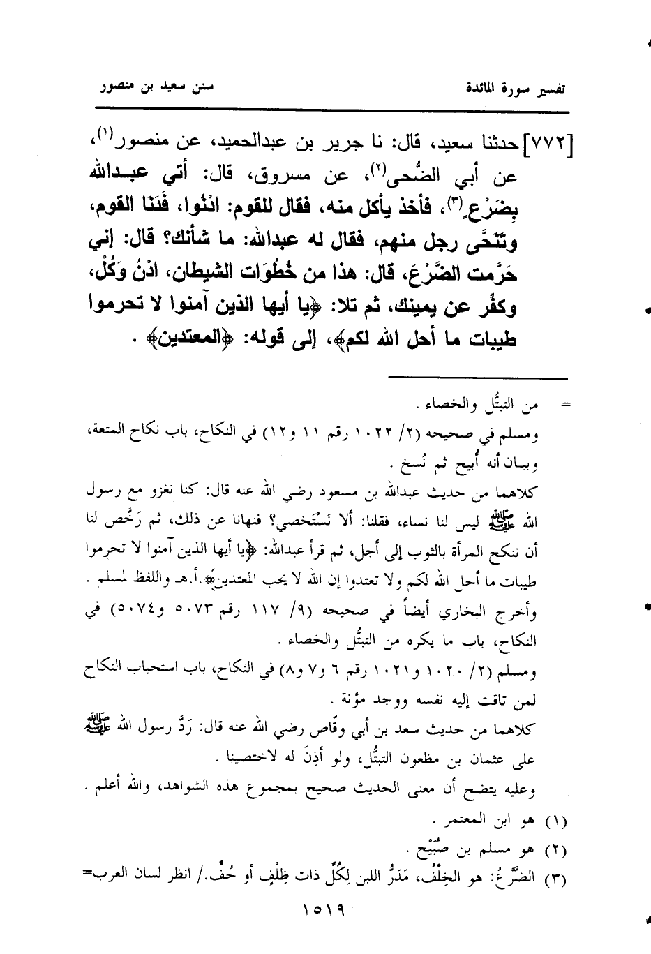 ٧٧٢ - حَدَّثَنَا سَعِيدٌ، قَالَ: نا جَرِيرٌ بْنُ عَبْدِ الْحَمِيدِ، عَنْ مَنْصُورٍ (¬١)، عَنْ أَبِي الضُّحى (¬٢)، عَنْ مَسْرُوقٍ، قَالَ: أُتِيَ عَبْدُ اللَّهِ بِضَرْعٍ (¬٣)، فَأَخَذَ يَأْكُلُ مِنْهُ، فَقَالَ لِلْقَوْمِ: ادْنُوا، فَدَنَا الْقَوْمُ، وتَنَحَّى رَجُلٌ مِنْهُمْ، فَقَالَ لَهُ عَبْدُ اللَّهِ: مَا شَأْنُكَ؟ قَالَ: إِنِّي حَرَّمت الضَّرْعَ، قَالَ: هَذَا مِنْ خُطُوَات الشَّيْطَانِ، ادْنُ وَكُلْ، وكفِّر عَنْ يَمِينِكَ، ثُمَّ تَلَا: {يَا أَيُّهَا الَّذِينَ آمَنُوا لَا تُحَرِّمُوا طَيِّبَاتِ ما أحل الله لكم} إلى قوله {لمعتدين}.