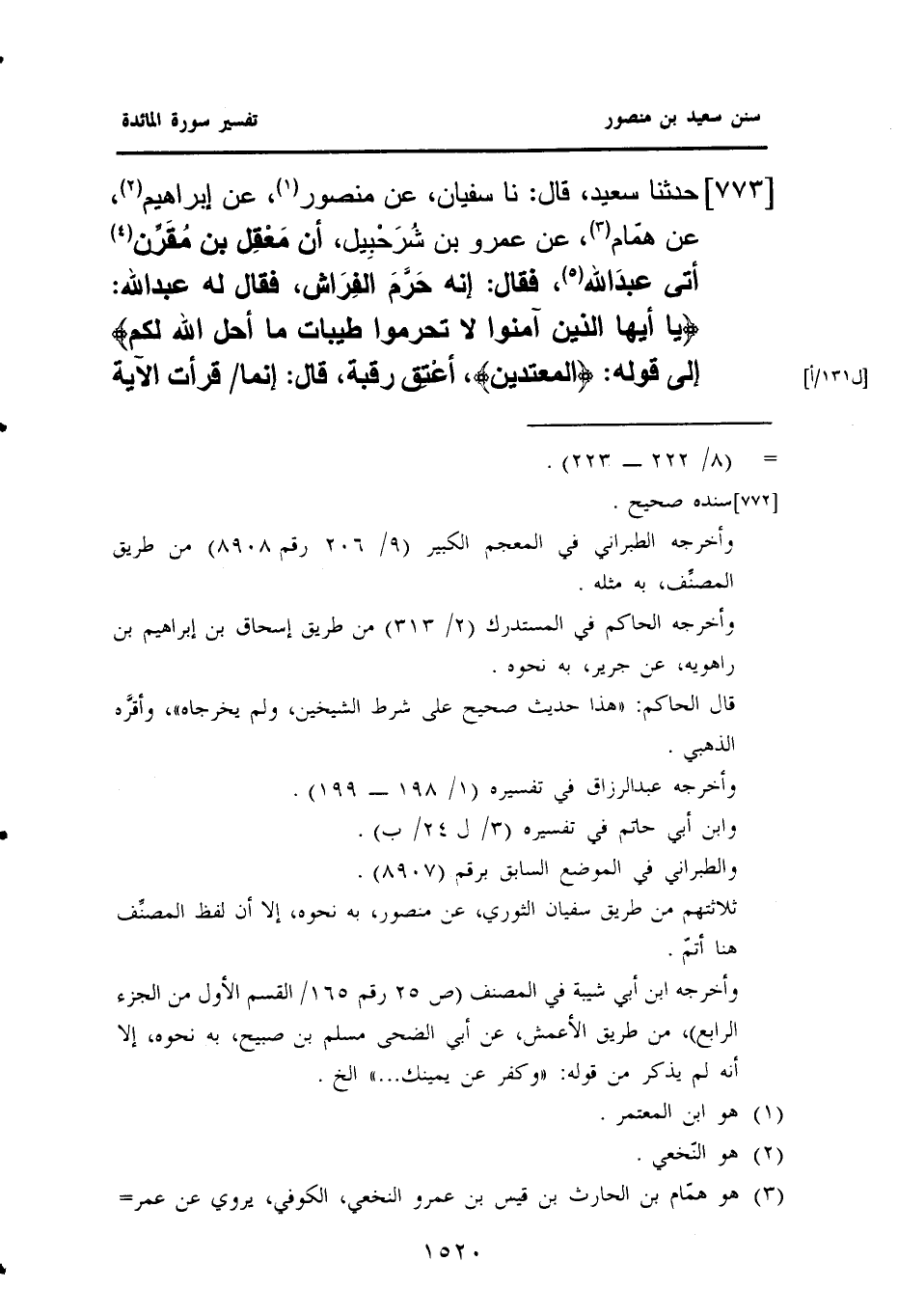 ٧٧٣ - حَدَّثَنَا سَعِيدٌ، قَالَ: نا سُفْيَانُ، عَنْ مَنْصُورٍ (¬١)، عَنْ إِبْرَاهِيمَ (¬٢)، عَنْ هَمَّامٍ (¬٣)، عَنْ عَمْرِو بْنِ شُرَحْبِيل، أَنَّ مَعْقِل بْنَ مُقَرِّن (¬٤)، أَتَى عَبْدَ اللَّهِ (¬٥)، فَقَالَ: إِنَّهُ حَرَّمَ الفِرَاشَ، فَقَالَ لَهُ عَبْدُ اللَّهِ: {يَا أَيُّهَا الَّذِينَ آمَنُوا لَا تُحَرِّمُوا طَيِّبَاتِ مَا أَحَلَّ اللَّهُ لكم} إلى قوله: {المعتدين}، أعْتِق رقبة، قال: إنما [١٣١/أ] قرأت الآية